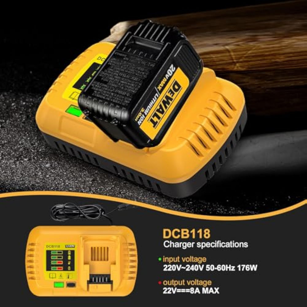 ?Specification?Input: 120V;Output: 22V 8.0A ; Model: Rapid Charger For Dewalt Battery | | ?Compatible With Dewalt Battery Model?100% Compatible With Dewalt 20V And 60V Max Lithium Ion Battery: Dcb208 Dcb206 Dcb205 Dcb204 Dcb203 Dcb210 Dcb240 Dcb606 Dcb609 Flexvolt Battery And Etc. Replacement For Dcb105, Dcb112, Battery Rapid Charger | | ? Rapid Charge?8.0A Max Output, Provide Faster Charging Time For Dewalt Battery, Less Than 30 Minutes For 2.0 Ah Battery And Less Than 75 Minutes For 6.0 Ah Battery. Charges A Dcb606 Battery In 60 Minutes | | ?Led Indicator?Not Only Tells You If The Battery Is Charging Or Fully Charged, But Also Checks Whether The Battery Is In Good Condition. The Fan Assisted Cooling Results In Faster Charge Times And Reduced Downtime | | ? Safe Reliable?The Battery Charger Has Passed Ce/Fcc/Rohs Certified, Built-In Input Low-Voltage, Output Short, Overload, Over-Current, And Over-Temperature Protection, It Equipped To Prote.