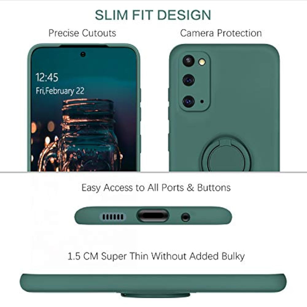 | ?Galaxy S20 Phone Case?Compatible With 6.2 Inch Samsung Galaxy S20 / S20 5G Only, Not Fit For Any Other Phone Models. ?Built-In 360°Rotatable Ring Holder, Flexible Kickstand And Magnetic Car Mount Supported.? | | ?Slim Smooth?Tired Of Having A Heavy Bulky Cover This Dark Green Case Is The One. It Fits Your Galaxy S20 Like A Glove. Sleek And Lightweight, Adds Reasonable Protection Without Being Too Bulky And Clunky. | | ?Reasonable Protection?Being Snug Fit With Premium Silicone And Fine Craftsmanship, This Slim Lightweight Design Hybrid Hard Back Galaxy S20 Case Is Durable Enough To Protect Your Phone From Bumps, Scratch And Occasional Drops. | | ?Camera Protection?There’S A Decent Amount Of Lip Protecting The Phone And Marries Up To The Volume Controls, Port, And Camera Perfectly. All The Button Features And Cutouts Are Where They Should Be And There'S Plenty Of Space Around The Cutouts For Easy Connection And Photographing. (Without Screen Protector) | | ?Perfect Gifts?Being Simple And Classy, It Doesn'T Take Away From The Actual Design Of Your Galaxy S20 Phone, Showing Off The Beauty Of The Phone While Offering Certain Protection. Perfect Gift For Wife, Mother, Daughter, Girlfriend And Friends For Anniversary Day, Mother'S Day, Birthday, Christmas Day, Valentine’S Day, Etc. You Won’T Miss It? | |
