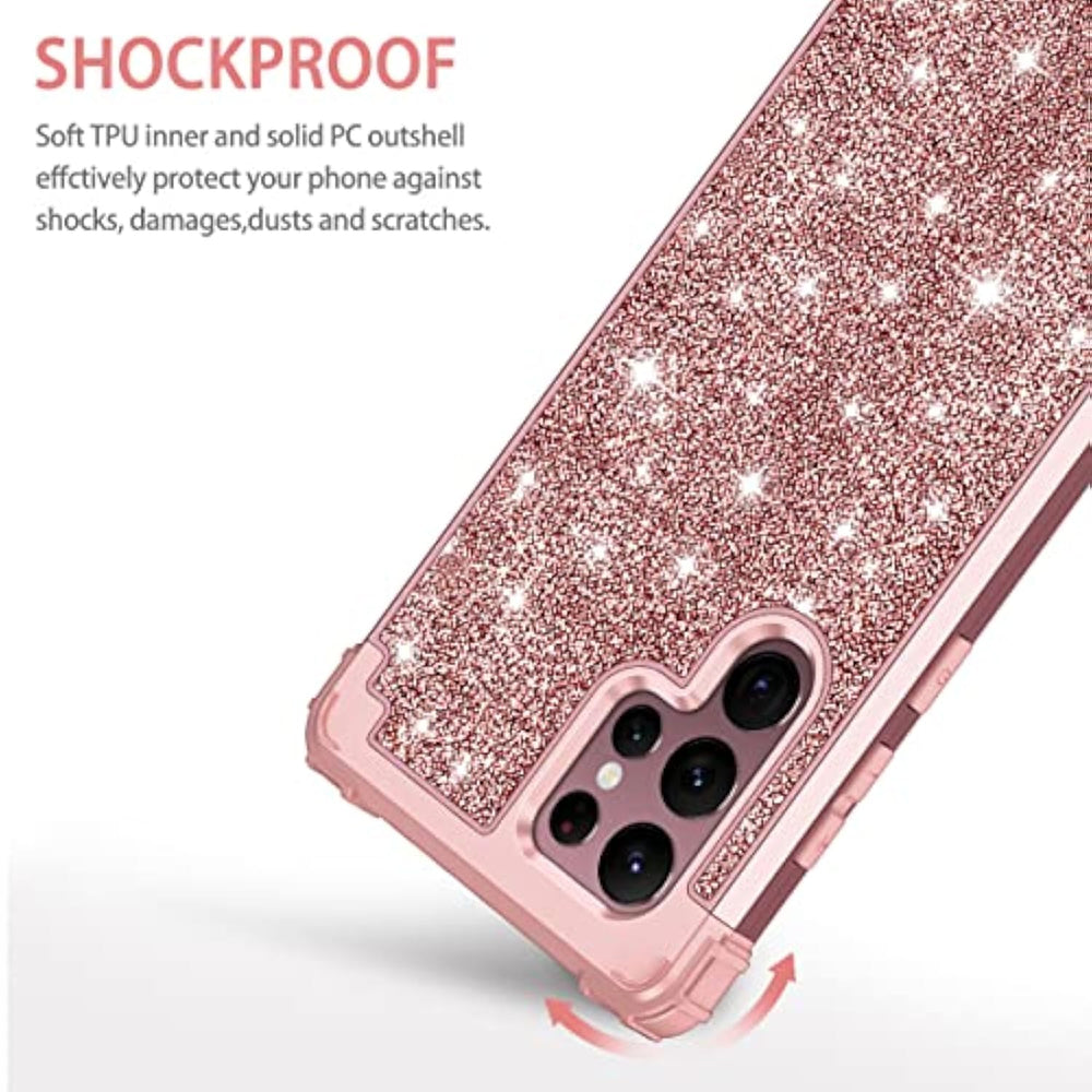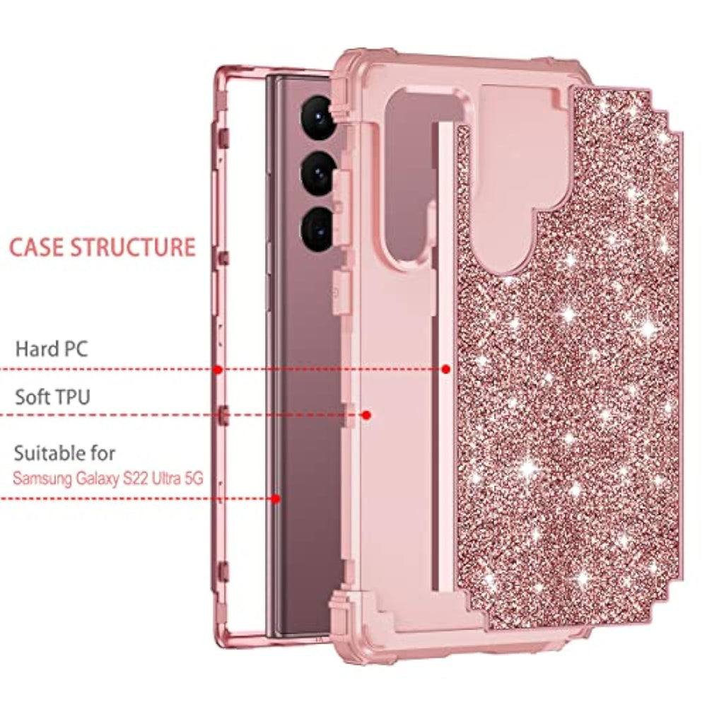 | Specially Designed For Samsung Galaxy S22 Ultra 5G, Please Kindly Attention That This Case Without Built-In Screen Protector. | | Luxury Bling Bling Style: Solid Color With Sparkles Makes You And Your Phone Look Glamorous Fashionable, Perfect For Your Girlfriend, Wife, Daughter And Friends On Her Birthday Or A Holiday. | | 3 In 1 Design: The Galaxy S22 Ultra Glitter Case Made Of Plastic Back Cover + Plastic Bumper + Silicone Inner Frame Maximum Protects Your Phone From Drop And Scratch Protection. | | Full Degree Of Protection: Covers All Four Corners And Includes Raised Edges And A Pcsilicon Lip To Keep The Screen From Scratching Or Touching The Ground. | | Precise Cut And Design: Easy Access To All Ports, Sensors, Speakers, Cameras And All Features. Wireless Charger Compatible. | |