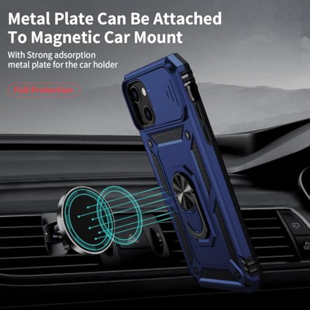 | ???Durable And Delicate Phone Case? Armor Case With Sliding Camera Cover Specially Designed For Iphone 13 . The Precise Cutout Design Of This Phone Case Ensures Perfect Alignment With Buttons, Camera, Speakers, And Ports Of Your Phone, Allowing For Easy Access And Comfortable Pressing??? Please Note: The Metal Ring On The Back Of This Case Renders It Incompatible With Wireless Charging. | | ???Military Grade Protection?This Double-Layer Tpu+Pc Case Is Shockproof And Protect Your Phone Against Drops And Bumps Via Maximum Shock Absorption. It Is Certified By Military Standard. It Has Been Tested To Survive Over 8,000 Drops From Heights Of Up To 10Ft! The Flexible Tpu Interior Absorbs Impacts, While The Reinforced Corners On The Exterior Enhance Protection During Falls. | | ???360°Rotation Magnetic Ring Kickstand?This Newly Upgraded Multi-Functional Case Includes A Built-In Ring Kickstand And Metal Patch. The 360° Rotating Ring Provides Two Stand Modes For Vertical Or Horizontal Viewing, Making It Useful As A Ring Holder To Free Up Your Hands While Watching Videos. Additionally, The Metal Patch On The Back Easily Attaches To A Magnetic Car Mount, Providing Convenience For Navigation During Driving. With Such Powerful Functions, You’Ll Love How Convenient This Case Is.Dropping Down. | | ???Crafted For Camera Security ? This Iphone 13 Phone Case Has Upgraded Camera Cover Protection. When Not In Use, The Camera Cover Can Be Moved To The Left To Hide The Camera, Ensuring The Utmost Protection For Your Precious Camera Lens Against Scratches And Bumps. It Is Very Convenient To Use And Does Not Affect The Quality Of Photos. | | ??? Service?Package Come With 1 Pack Case And 1 Pieces Pet Hd Screen Protector (Plastic). Provides You Service. If You Have Any Problems With Our Products, Please