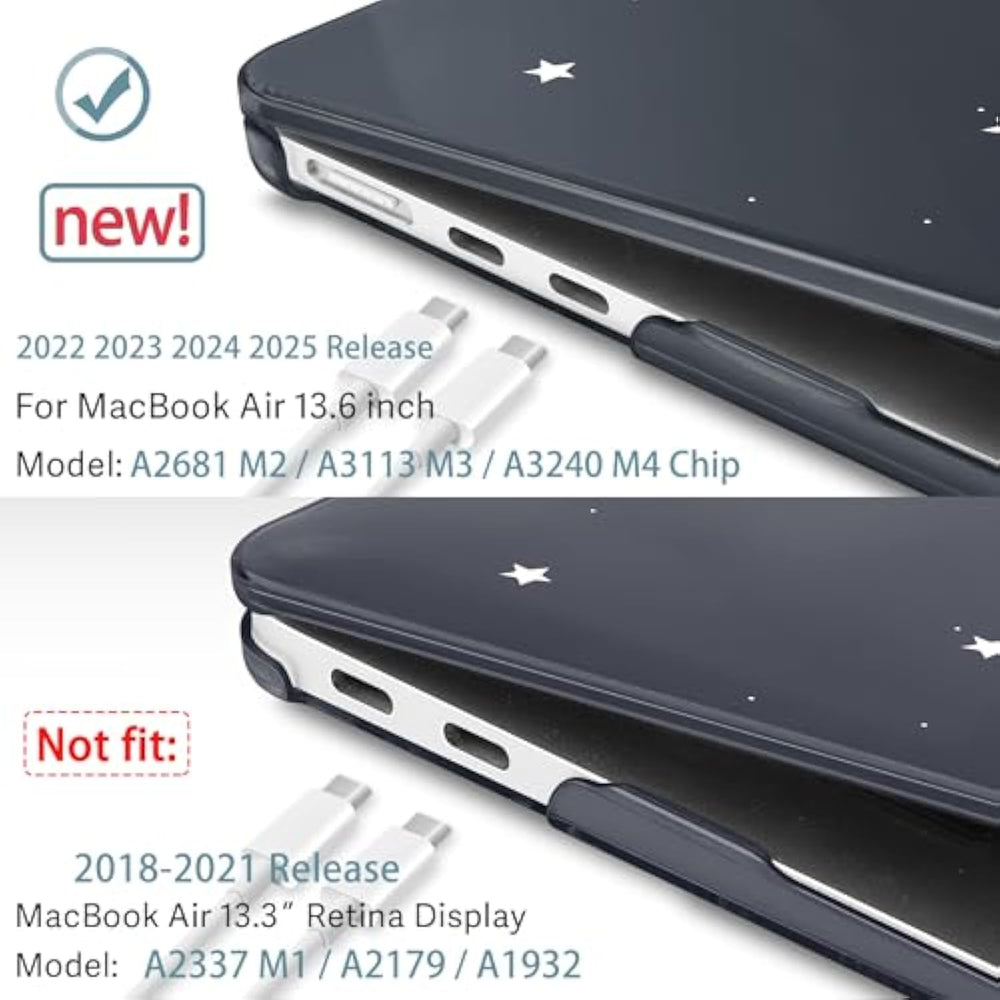 | Designed Only To Be Compatible With Macbook Air 13.6 Inch 2025 2024 2023 2022 Newest Release Model: A3240 M4 A3113 M3 A2681 M2 Chip With Liquid Retina Display Fits Touch Id. Pls Verify Model No. The Underside Of Laptop Before Buying. | | Compatibility Warning: This Case Is Not Compatible With?2018-2021? Macbook Air 13.3 Inch Older Model: A2337 M1 / A2179 / A1932 With Retina Display And Touch Id. | | Ventilation And Heat Dissipation?Featuring Two Rows Of Bottom Ventilation, Allowing Safe Heat Disbursement To Keep Your Device Cool, Featuring All-Inclusive Design To While Protecting Your For Notebook From Everyday Scrapes And Scratches. | | Case Dimension: 12 X 8.5 X 0.46 Inch, Compatible With Macbook Air 13.6 Inch M2 M3 Case With Dimension: 11.97 X 8.46 X 0.44 Inch (2022 2023 2024 Released). Ultra Slim Light Weight Hard Case Has 8.7 Oz In Weight And 1.4 Mm In Thickness. Easy To Use Without Adding Weight. | | Snap On Design, Easy To Install And Disassemble And Easy On And Off, Fully Vented For Heat Disbursement, Fully Access To All Ports And Features, Plug Your Charger, Cable Or Headset Without Removing The Case. Package Including Keyboard Cover, Dust Plug And Screen Protector To Protect Your Keyboard Screen Against Spills. | |
