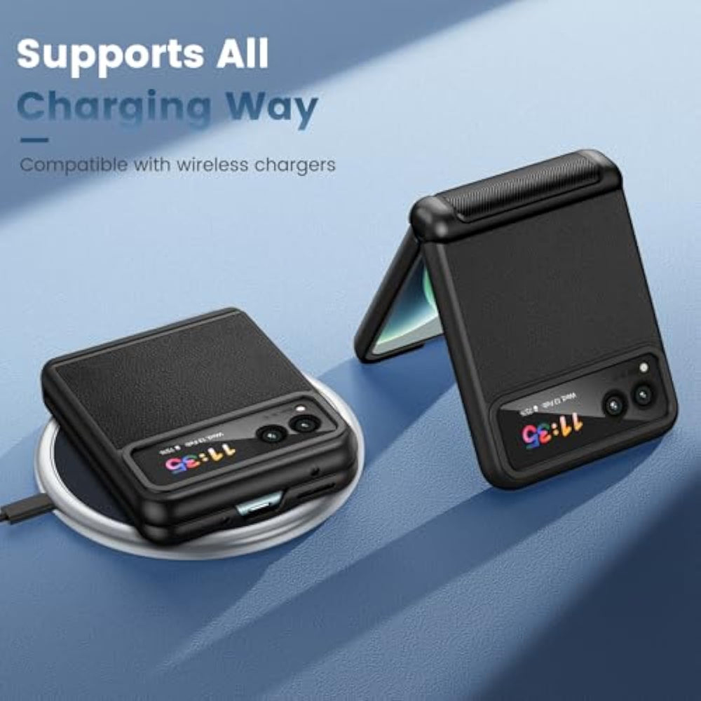 | Compatibility: Leather Case Only Compatible With Motorola Razr 2023. (Notice: 1. Does Not Fit Motorola Razr Plus 2023, Please Confirm The Phone Size Carefully Before Buying. 2. Support Wireless Charging.) | | Hinge Protection: The Hinge Adopts A Twill Anti-Skid Design And Built-In Shockproof Airbag, Which Effectively Reduces The Impact Force And Provides Strong Full-Body Protection For The Fragile Hinge Of Motorola Razr 2023. | | Built-In Invisible Kickstand: The Built-In Stand Of The Moto Razr 2023 Case Is Very Stable And Will Not Fall Off Easily. This Can Help You Keep Your Hands Free When Watching Web Pages And Videos. | | Built-In Camera Protector: The All-Inclusive Tempered Glass Camera Lens Protector Can Protect Your Camera And Camera Screen From Scratches, And There Is No Fear Of Damage To The Camera Screen Caused By The Keys In The Pocket Or Other Things In The Bag. | | Precise Cutouts: Precise Cut Buttons That Have A Gentle Feel Provide You With Easy Access To All Buttons, Switches, And Functions Perfectly. | |