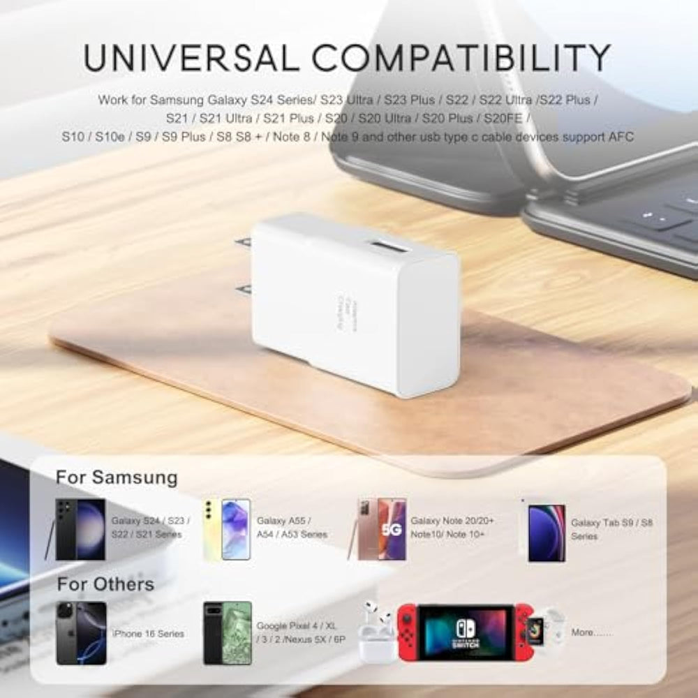 | ?Samsung Adaptive Fast Charging?Samsung Fast Charger Charges Up To 50% Battery Level In 30 Minutes, 75% Faster Than Standard Chargers. Fast Speed Charging, Less Time. | | ?Quick Charging Broad Compatibility?Compatible With Galaxy S24/S24+/S24Ultra/S23,S23+,S23Ultra,S22/S22+/S22Ultra/S21,S21+,S21Ultra,Note 20,S10, S10+ Plus, S10 5G, S20, S9, S9+ Plus, S8, S8+ Plus / Active, Note 10,Note 10 Plus,Google Pixel, Pixel 2, Pixel 3, Pixel Xl, Pixel 2Xl, Pixel 3Xl, Pixel 3A,Lg G7 Thing, G6, G5, Stylo 4, V20, V30, V35, V30S, V40 Thinq Plus, Motorola Moto Z And Other Fast Charger 2. 0 (Qc2. 0) Supported Devices | | ?Safety ?Samsung Fast Wall Chargers Built-In Safeguards That Fully Protect Against Over-Current, Over-Charging And Over-Heating Charging. It Have No Any Risk Of Overheating Or Damaging Devices, Keep A Safe But Fast Charging. | | ?Fast Charge Sync?Fast Charger Kit Charges Galaxy Phones And Tablets With Usb Ports At Max Speed. Offers Superspeed Transfer Of 480 Mbps. It Is Specially Designed For Smartphones, Tablets, And Bluetooth Speakers. | | ?What You Get?2 X Adaptive Fast Charging Adapter(Charger Cable Is Not Included). You Could Have One At Office And One At Home. It Is Lightweight, Compact That Is Eay To Take It To Anywhere. | |