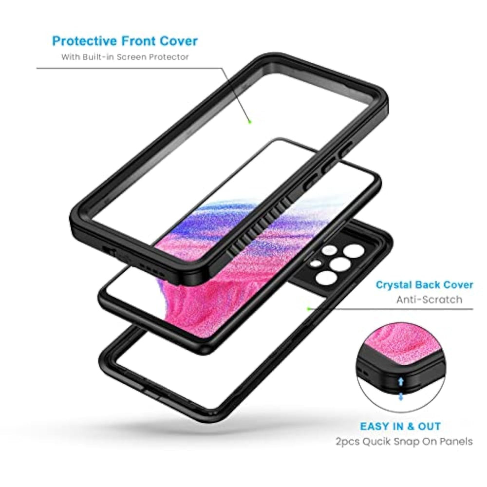 | Ip68 Certified Waterproof : Perfect Waterproof Case For Samsung Galaxy A53 5G /4G, Extreme Safe Even After 1000 Times Test Of Using Underwater 6.6Ft For 1 Hour | | Full Body Protection : Waterproof, Shockproof, Dustproof, Full Sealed Design Exceeds Military Standard To Adapt Any Outdoor Activities; With A Phone Strap For Convenient Carrying | | High Touch Responsive : Built-In Hd Plastic Screen Protector Prevents Scratch, Damage And Dirt, Also Won'T Affect The Touch Sensitivity; Clear Back Cover Will Show Off The Beauty Of Your Galaxy A53 | | Compact And Lightweight : Tpu Material With Hard Plastic Frame, Makes Your Phone Lightweight And Tough; Slim Body (17.5 *8.8 *1.4 Cm) Doesn'T Add Much To The Size Of Your Galaxy A53 5G | | Easy Installation : Two Covers (Front/Back) Snap On Design Makes It Fast And Easy To Install Or Take Off In Seconds, Suitable For Daily Use | |