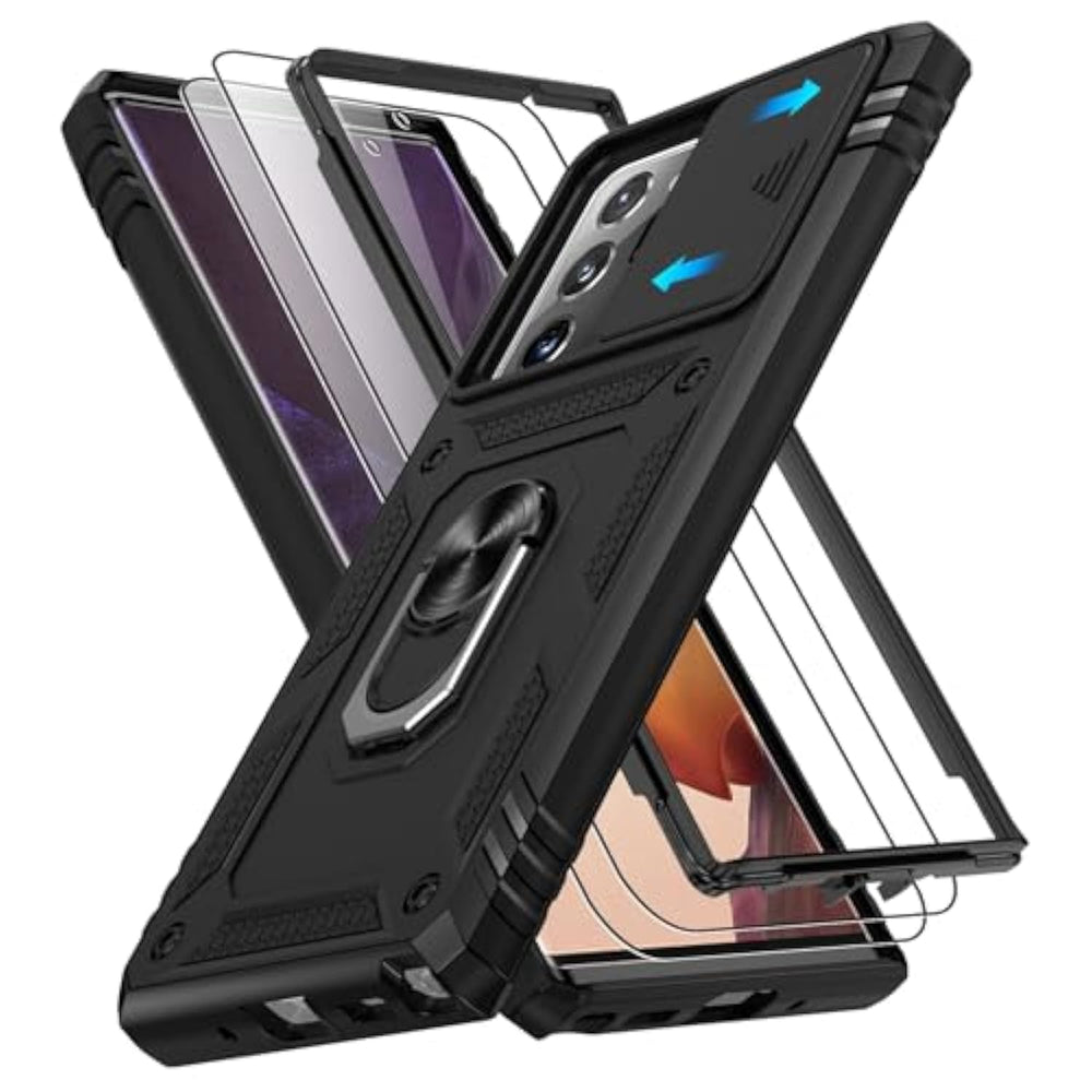 | Perfect Fit And Durable: The Case Fits The Samsung Galaxy Note 20 Ultra Case 6.2 Inches Perfectly. Please Remove The Front Frame Pc Bumper In The Case Before Installation, Not Appropriate To Install The Phone Directly Into The Case. Note: Wireless Charging Is Not Supported | | Military Grade Protection: Samsung Galaxy Note 20 Ultra 5G Case Dual Layer Back Bumper ( Soft Tpu + Built-In Pc ) + Pc Front Bumper. Exterior With 4 Reinforced Corners Can Effectively Absorb The Impact Of Falling, To Protect Your Phone Against Scratches | | Camera Sliding Window: Galaxy Note 20 Ultra Case Is Unique Camera Slider Design Protects The Camera Lens From Scratches, Abrasions, Bumps, And Shocks. Just Slide Left And Right To Protect/Use The Camera Lens | | Built In Metal Kickstand Ring: Galaxy Note 20 Ultra 5G Case Is Built-In 360° Rotating Metal Stand On The Back, Easy To Swivel, Offers 180° Verti