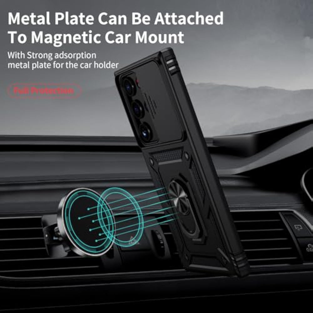 | Durable And Suitable: The Phone Case Designed By For Samsung Galaxy S22 Ultra, With Precise Cuts, Easy To Install And Perfectly Align With Your Phone. Note: Wireless Charging Not Supported | | Military-Grade Protection: Double-Layer Tpu+Pc Structure. The Inner Tpu Layer Endows The Four Corners With Shock Absorption, Protecting The Phone Against Damage In Drops And Bumps. The Outer Pc Layer Protects The Phone From Abrasions | | 360° Magnetic Ring Stand: The Phone Case, Equipped With A Built-In Magnetic Ring Stand And Metal Patch, Allows Both Vertical And Horizontal Modes For Watching Movies. Free Your Hands. The Metal Patch Can Be Connected To A Magnetic Car Mount, Convenient For Navigation And Hands-Free Viewing | | Camera Safety Design: The Newly Upgraded Camera Cover Can Be Slid Smoothly. If Taking Pictures, Open The Cover, If Not, Close It To Protect The Lens, The Cover Can Be Slightly Fixed In Two Sides | | High Quality After Sales Service : Offer Sincere Service To Create A Pleasant Shopping Experience. If There Is A Problem With Your Product, Please