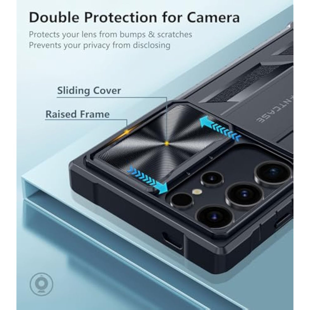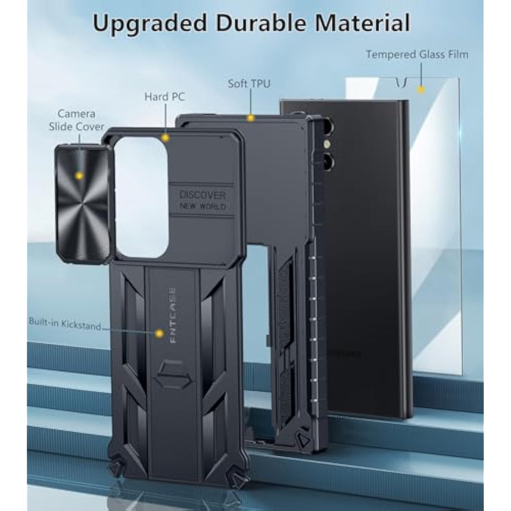 | Compatibility: Military Grade Heavy Duty Protective Phone Cover Tough Case Defender Designed For Samsung Galaxy S24 Ultra 5G, Released 2024. Our Vanguard Armor Phone Case Is Compatible With Galaxy S24 Ultra 6.8Inch | | Upgraded Anti-Scratch Sliding Camera Protection: Delicate Camera Lens Sliding Cover, Higher Than The Raised Camera Protects Your Samsung Galaxy S24 Ultra Phone Camera From Scratches,Collision, Scuffs And Impact.Unique Camera Slide Cover Design To Hide The Camera Perfectly, Which Not Only Increases Safety But Also Has A Sense Of Technology.Preventing From The Disclosure Of Our Privacy. You Can Slide It Freely | | Built-In Kickstand: The Aesthetic Galaxy S24 Ultra Case With Built In Foldable Stand With Vertical And Horizontal Viewing Angles Free Your Hands To Do Other Things.The Holder On The Back Of The Heavy Duty Military Armor Phone Case Can Provide A Good Support.Convenient For Reading, Watching Movies, Playing Games,Browsing The Web And Face-To-Face Chatting With Friends | | Military-Grade Drop Protection: Certified Drop Test, Unique Shock Absorption Design Drop Protection.This Case Is Made With A Matte Hard Pc Tough Back And Flexible Thermoplastic Soft Touch Tpu Shock-Absorbing Bumpers Rubber Cushions And That Provides Excellent Shockproofing And Anti-Drop Protection To Protect Your Phone Against Accidental Drops, Shock, Impacts,Bumps And Scratches | | Excellent Grip Armor Anti-Skid Design: Processed Tpu Frame Provide With Delicate Touch Feeling And Non-Slip.The Non-Slip Bumper Provides Excellent Grip And Prevents Your Phone From Slipping Out Of Your Hand.Especially Full Back Protection With Textured Edges And Impact Resistant Hard Pc Shell Back Cover.Armor Design Rugged Phone Case,Suitable For Running, Mountaineering, Camping Or Any Other Outdoor Sports.Also Perfect To Be A Gift For Men, Women, Girls, And Boys | |