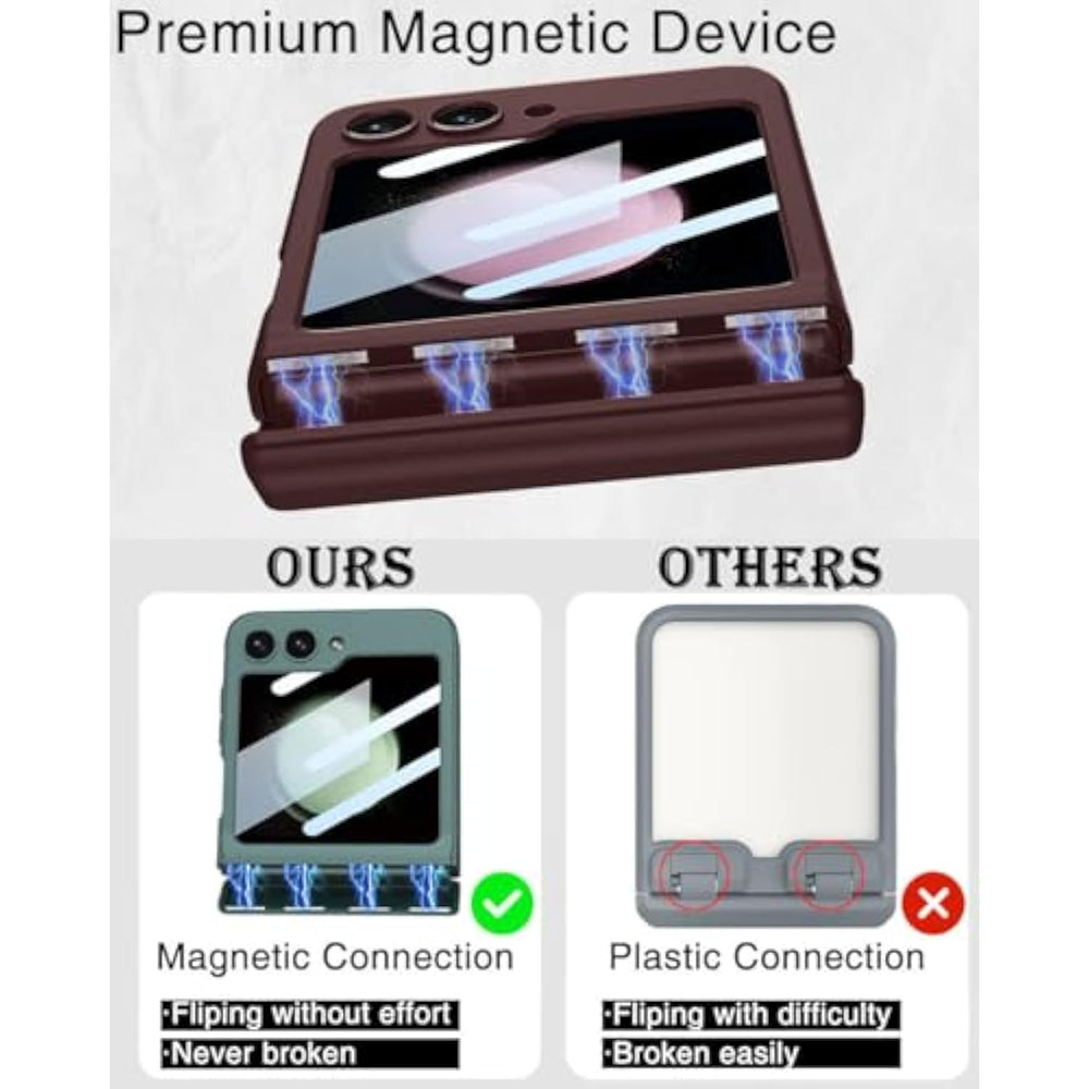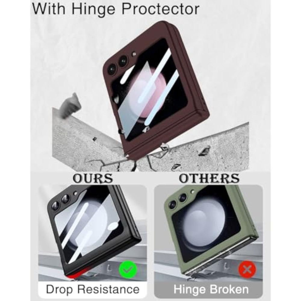 | [Designed For Z Flip 5 Case 2023]: This Case Is Exclusively Designed Perfectly For The Samsung Galaxy Z Flip 5 Model Released In 2023, Ensuring A Seamless And Tailored Fit. | | [Premium Matte Pc]: Crafted From High-Quality Matte Pc Material, This Case For Z Flip 5 Case Offers A Good Texture And A Skin-Friendly Feel. Its Slightly Matte Finish Helps Minimize Fingerprints, Hand Sweat, Oil, And Dust, Keeping Your Device Looking Pristine At All Times. | | [Hinge Protection]: Our Exclusive Case For Galaxy Z Flip 5 Features An Upgraded Hinge Protection Design That Fully Shields Your Phone From All Angles, Providing Enhanced Durability. The Seamless Connection Between The Upper And Lower Case Makes Opening And Closing More Convenient. | | [Full 360° Protection]: Enjoy Comprehensive Protection With A Screen Protector That Offers 100% Front Screen Protection. The High-Quality Glass Screen Protector Is Specifi