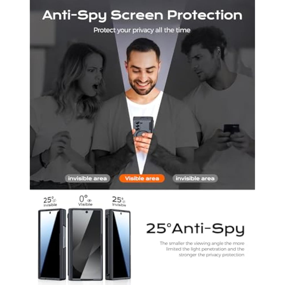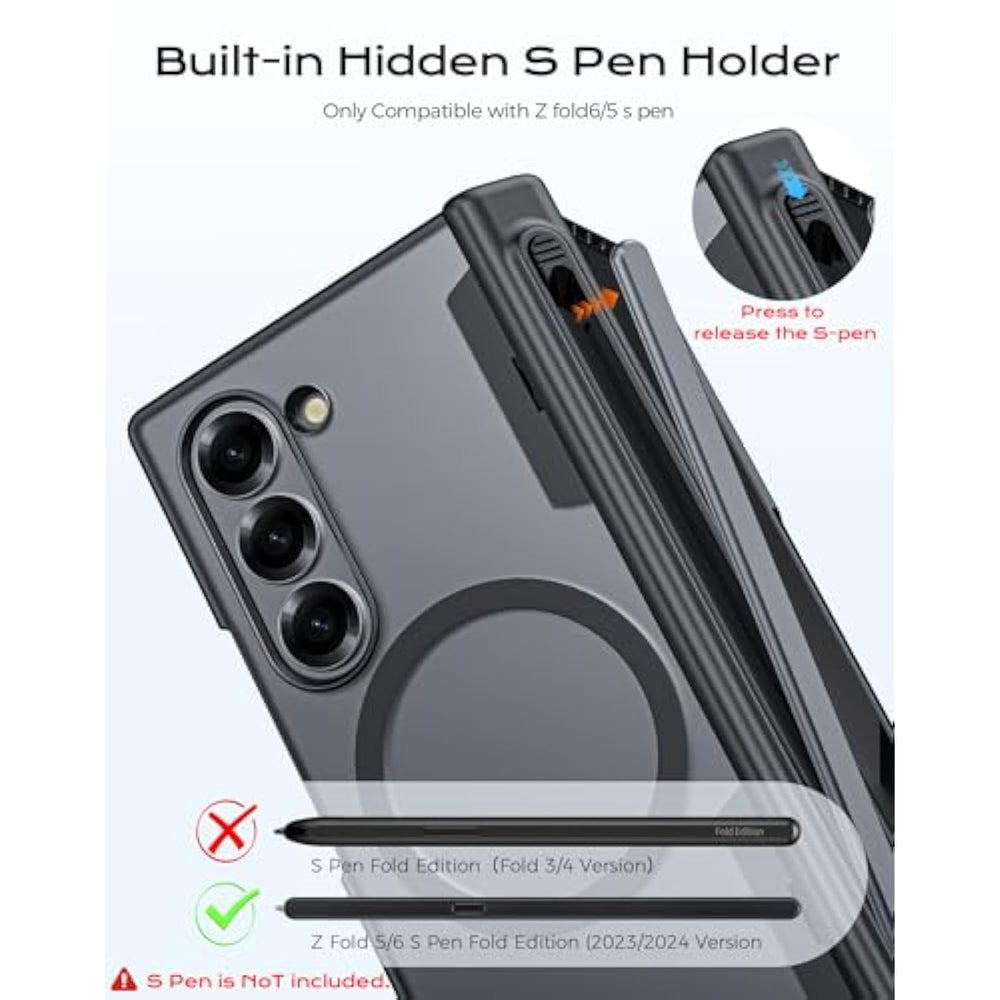 | ???Compatible Models Operation Guide?Compatible With Samsung Galaxy Fold6 (Released In 2024). ?? Note: This Protective Case Does Not Include The S Pen. Remove All Third-Party Screen Protectors Before Use To Avoid Affecting Touch Responsiveness And Sensitivity. | | ???Super Strong Magnetic Lock Seamless Linking Of Mag-Safe Accessories? Galaxy Z Fold 6 Case Upgraded Super Magnetic Lock Is Embedded With 38Pcs N52 Grade Magnets With A Suction Force Of 1,500 G, Which Is More Than 40% + More Than Other Magnetic Phone Cases. The Perfectly Aligned Magnets Make Using Wireless Charging Easier Than Ever And Provide A Secure Lock For Any Mag-Safe Accessory, Such As Magnetic Wallet/Mobile Power Supply/Car Mount, Etc. The Case Ensures A Secure And Stable Connection Even When Rotating Or Moving Around, Allowing You To Enjoy A Smarter And More Convenient Life Experience. | | ???Superior Privacy Build A Rugged Second Screen?Galaxy Fold 6 Privacy Screen Protector Tempered Glass Is Made With Dual Ion Exchange Technology, A Technology That Enhances The Screen'S Impact Protection And Smoothness. The Leading 25° Ultra-Narrow Privacy Angle Filter Blocks Left And Right Side Vision From Viewing What'S On Your Screen. When You View The Galxy Fold 6 Screen While In An Elevator, Subway, Bank, Or Other Public Place (External Screen Only), The Content On The Screen Is Visible Only To You, Perfect For Privacy-Conscious People. | | ???Slimmer Pen Container, Your S Pen Within Reach?Adhering To The Compact And Slim Design Concept, The Upgraded Galaxy Z Fold 6 Case S Pen Holder With Hinged Cover Is A Perfect Combination (?? Note: Spen Is Not Included), Which Not Only Perfectly Preserves The Stylish Design Of The Phone, But Also Solves The Problems Of Bulky/Hard To Remove Pen/Broken Hinge, Striking A Balance Between Protection And Practicality. Gently Slide To Release The Spen And Infuse Your Creativity With Powerful Productivity At Any Time. Sturdy Hinged Cover Ensures A Smooth Connection With Your Phone Faster And More Durable Than Ever Before. A One-Time Investment Protects The Most Vulnerable Areas! | | ??? Floating Buttons Perfectly Aligned Ports?This Sleek And Slim Case Is Crafted Specifi