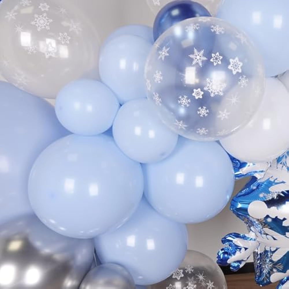 Frozen Party Decorations, Including 2Pcs 22In Snowflake Foil Balloons, 5Pcs 18In Balloons (Metallic Silver X1, Metallic Blue X1, Light Blue X1, White X2), 58Pcs 10In Balloons (Metallic Silver X10, Metallic Blue X10, Light Blue X20, White X10, Snowflake Balloons X8), 40Pcs 5In Balloons (Metallic Silver X10, Metallic Blue X10, Light Blue X10, White X10), Accessories(Balloon Chain Strip, Ribbon, Glue Dots). | High Quality Frozen Party Balloons Decorations: Winter Princess Balloon Arch, Made From High-Quality, Non-Toxic Material, Ensuring Durability. You Won'T Have To Worry About Balloons Tearing Or Bursting Prematurely. These Froze Balloons Can Be Filled With Air Or Helium, Perfect Choice To Enhance Any Indoor Or Outdoor Winter Wonderland Party Decorations. Snowflake Balloon Garland And Large Snowflake Foil Balloons, Fostering A Distinctive Winter Wonderland. | Occasions And Themes: Our Snowflake Balloon Garland Arch Kit Can Be Used As Frozen Themed Party Decorations, Frozen Birthday Party Decorations, Winter Ice Princess Decorations, Winter Wonderland Decorations, Ice Queen Party Decorations. Frozen Balloon Garland, Great For Decorating Indoor Spaces Like Living Room, Staircases, Fireplaces, Doorways, Walls, Windows, And Dining Tables, Or Outdoor Areas Like Gardens, Terraces, Courtyards, And Open-Air Venues. | Quick And Easy Assembly: The Winter Wonderland Ballons Decorations Comes With All Necessary Accessories, Making It Simple For Anyone To Create A Beautiful Balloon Arch For Winter Themed Party Decorations. You Can Easily Assemble A Stunning Winter Balloon Arch, Ideal For Diy Projects And Party Planners Alike. The Winter Balloon Garland Are Sure To Become The Focal Point Of Your Frozen Party Decorations And A Captivating Photo Backdrop. | Additional Reminder: 1.Please Allow 30 Mins To An Hour To Set Up A Balloon Garland. 2.The Small Amount Of Dust On Latex Balloons Is A Safe Material To Prevent The Balloon From Sticking. A Balloon Pump Is Recommended To Inflate. 3. Not To Inflate The Balloons More Than 90% To Avoid Sudden Popping. 4.Please Allow Certain Color Differences Between The Actual Item And Pictures Caused By The Monitor. |