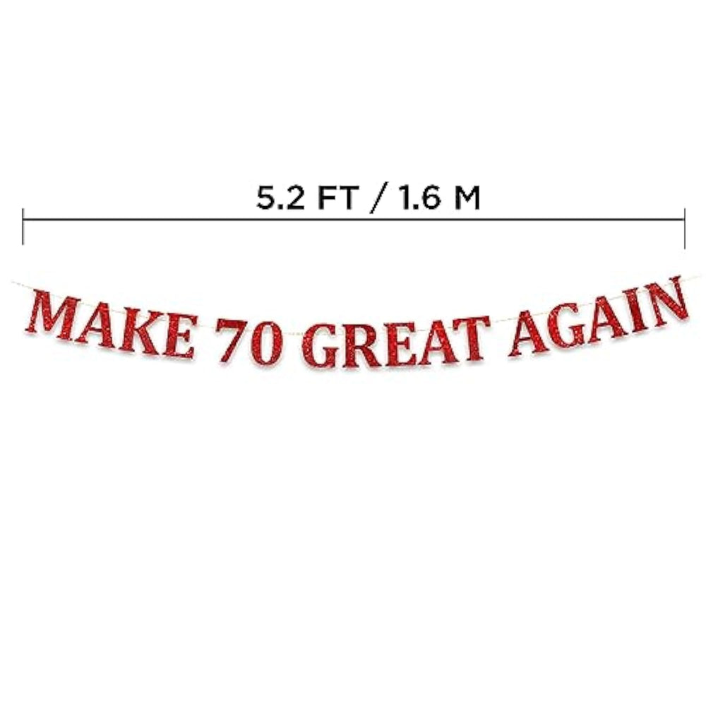 | Banner Comes Pre-Strung | | Make 70 Great Again! The Beautiful, Red Glitter Accents Matches The High Quality Lettering And Will Definitely Catch The Attention Of Your Loved Ones. . | | So Many Uses: Use It For A 70Th Birthday, Anniversary, Or Retirement Party! This Banner Is Sturdy But Not Heavy And Meant To Be Reused. | | Size: Banner Is Petite And Measures Approximately 5.2 Feet. First Great Above A Dessert Table Or Fireplace Mantle. | |