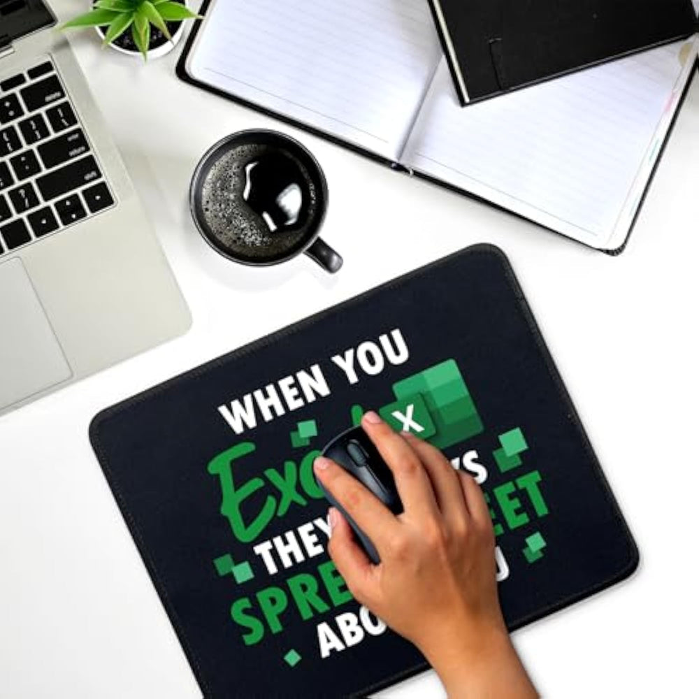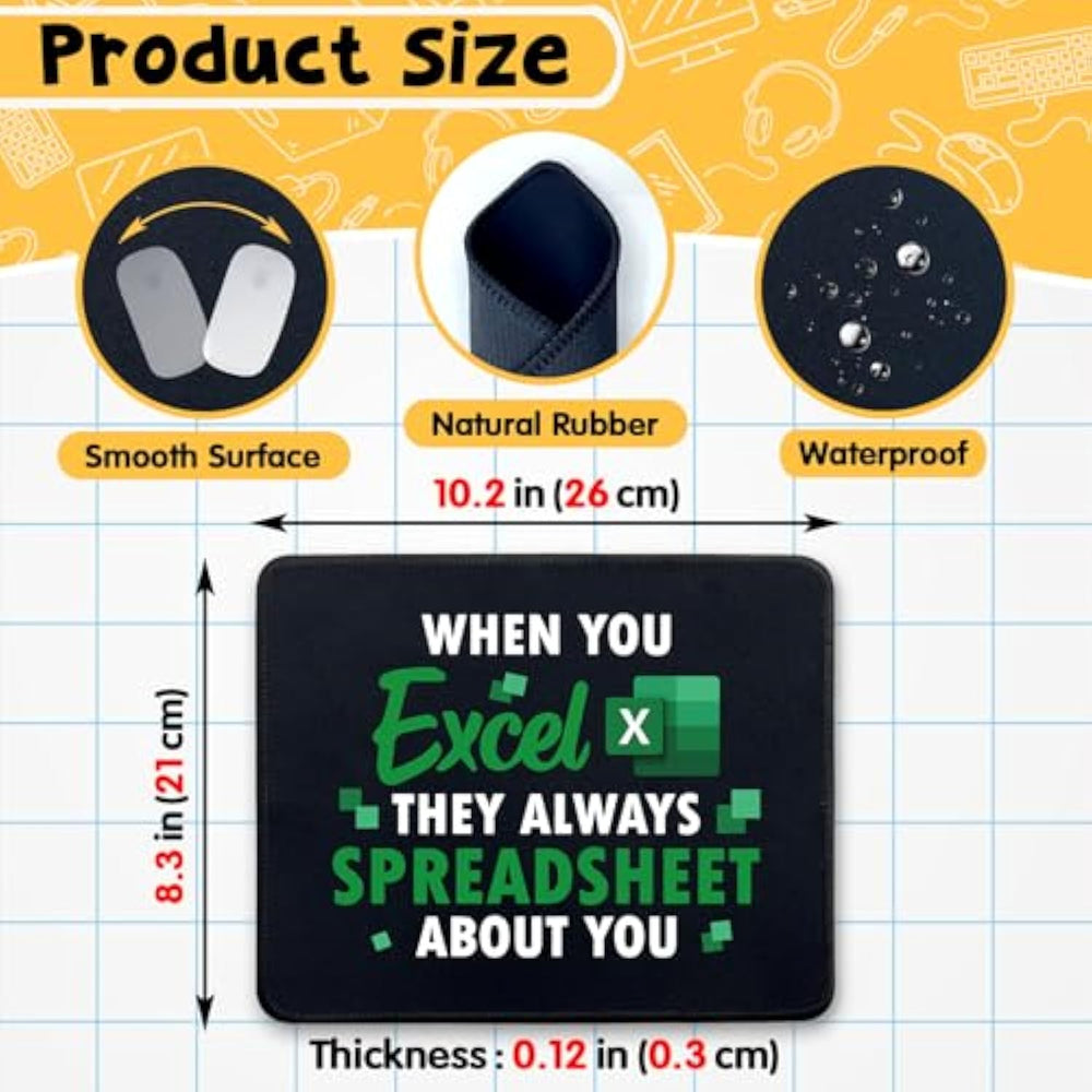 | Personalized Design: "When You Excel They Always Spreadsheet About You" - With Its Unique And Stylish Designs, This Rectangular Mouse Pad Is A Great Desk Accessory For Any Office Or Gaming Setup, Adding A Personal Touch | | Perfect Size: The Size Of This Rectangular Mouse Pad Is 10.2 X 8.3 X 0.12 Inches (26 X 21 X 0.3 Cm), Lightweight And Easy To Carry, Fits All Types Of Mice And Computers. You Can Take This Size No Matter Where You Go | | Premium Quality: Our Mouse Pad Is Made Of High-Quality Textured Cloth, Soft And Comfortable. The Smooth Surface Of The Mouse Pad Provides Mouse Movement Accuracy. The Delicate Stitched Edges Can Prevent Wear, Deformation And Ensure Long-Lasting Performance | | Non-Slip Rubber Base: The 3Mm Thick Natural Rubber Base Comes With Dense Non-Slip Texture, Keeping The Mouse Pad Firmly In Place And Preventing Any Unwanted Sliding Or Movement | | Practical Gift: With Colorful Patterns And Funny Sayings, The High Quality Mouse Pad Makes A Practical Office Gift For Your Family, Friend, Coworker, Employee And Boss. It'S Also The Best Choice For Birthday, Christmas, Congratulation Or Any Other Occasion | |