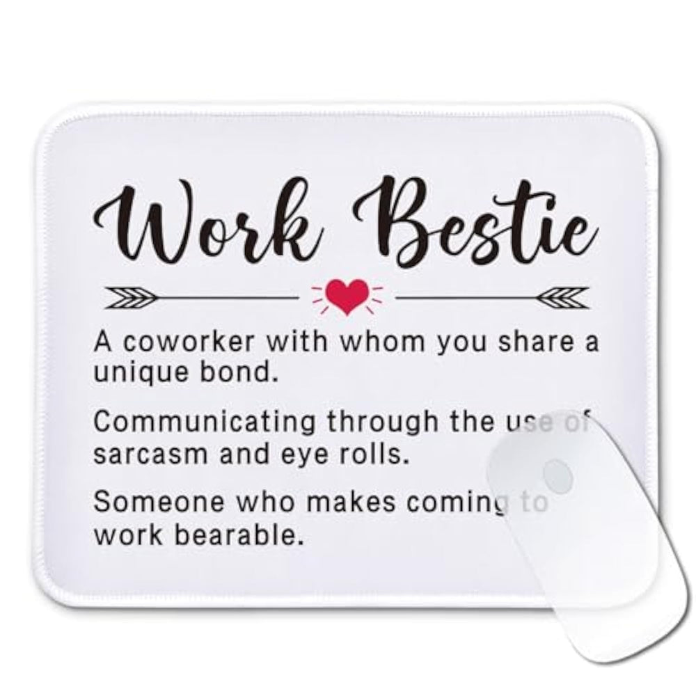 | Personalized Design: "Work Bestie Definition" - With Its Unique And Stylish Designs, This Rectangular Mouse Pad Is A Great Desk Accessory For Any Office Or Gaming Setup, Adding A Personal Touch | | Perfect Size: The Size Of This Rectangular Mouse Pad Is 10.2 X 8.3 X 0.12 Inches (26 X 21 X 0.3 Cm), Lightweight And Easy To Carry, Fits All Types Of Mice And Computers. You Can Take This Size No Matter Where You Go | | Premium Quality: Our Mouse Pad Is Made Of High-Quality Textured Cloth, Soft And Comfortable. The Smooth Surface Of The Mouse Pad Provides Mouse Movement Accuracy. The Delicate Stitched Edges Can Prevent Wear, Deformation And Ensure Long-Lasting Performance | | Non-Slip Rubber Base: The 3Mm Thick Natural Rubber Base Comes With Dense Non-Slip Texture, Keeping The Mouse Pad Firmly In Place And Preventing Any Unwanted Sliding Or Movement | | Practical Gift: With Colorful Patterns And Funny Sayings, The High Quality Mouse Pad Makes A Practical Office Gift For Your Family, Friend, Coworker, Employee And Boss. It'S Also The Best Choice For Birthday, Christmas, Congratulation Or Any Other Occasion | |