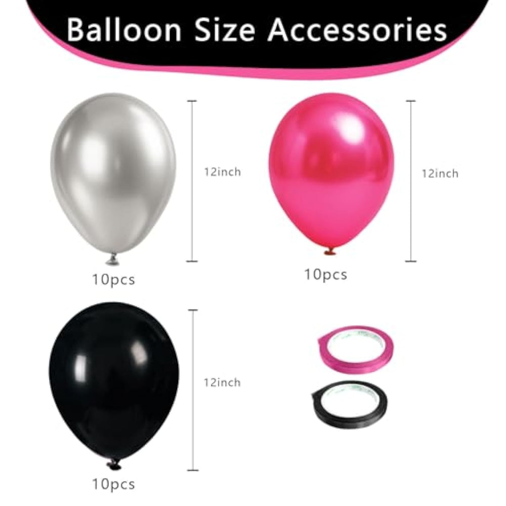 | What You Will Get :30 Pcs Hot Pink And Black Balloons Set?Includes 10 Pcs Hot Pink Latex Balloons, 10 Pcs Black Latex Balloons, 10 Pcs Silver Latex Balloons, And 2 Pcs Ribbons?Ideal For Making Balloon Arch Kits Or Birthday Decorations. | | Vibrant Party Decorations: Our Balloons Are Colorful And Eye-Catching.Perfect For Hot Pink Party Decorations, Bridal Showers?Pink And Black Birthday Decorations, Weddings, Anniversary Party, And Graduation Ceremony Or Themed Events With Black And Silver Or Pink And Silver Accents. | | Material Of Balloons:This Set Of Balloon Decorations Is Made Of High-Quality Latex, Which Has Been Manually Tested And Can Be Stretched Freely. It Is Durable And Safe, Suitable For Indoor/Outdoor Use, And Is A Good Choice For Parties And Gatherings With Friends. | | Easy To Assemble:You Can Simply Diy Decorate And Create The Party Style You Want, By Injecting Balloons Into Air Or Helium To Create Arches, Backgrounds, Or Dining Table Centers, And Sticking Them To Walls, Doors, Or Ceilings Or Connect It With The Attached Ribbon. | | Instructions:The Dark Balloon Appears Dark When Deflated But Reveal Vibrant Colors When Inflated. It'S Best To Inflate The Balloon To 90% Of Its Capacity?Avoid Over-Inflation, Direct Sunlight, Sharp Objects, And Friction For Long-Lasting Party Balloons. | |