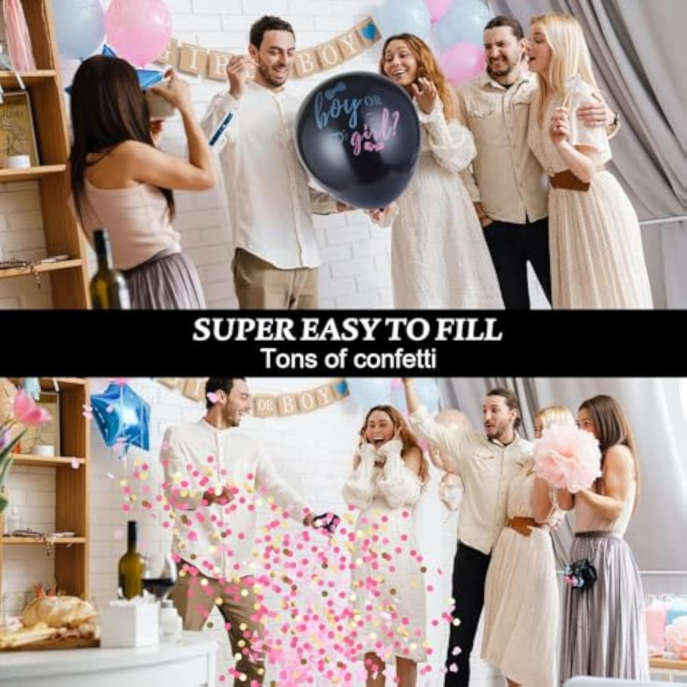 These thickened gender reveal balloons are made from high-quality latex that fully conceals the confetti color inside, keeping the baby's gender a surprise until popped. The kit includes eco-friendly, biodegradable pink and blue confetti, ensuring a safe and odor-free celebration. Easy to fill with helium, these 36-inch balloons float beautifully, creating a fun and memorable reveal moment. Perfect for baby showers and gender reveal parties, they make a stunning backdrop for photos and videos as confetti bursts into the air.