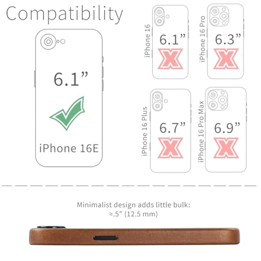 | Slim Lightweight: This Genuine Leather Case Keeps Your Iphone 16E Sleek And Stylish, Measuring Just 12.5 Mm Thick (0.49") And Weighing Only 38 Grams (1.4 Oz), Ensuring A Comfortable Fit In Your Hand And Pocket Without Unnecessary Bulk. | | Luxurious Oil-Waxed Top-Grain Leather Evolving Grip: This Case Features A Durable Hard Shell Wrapped In Oil-Waxed Top Grain Leather, Showcasing Natural Variations In Texture And Tone For A Refined, Timeless Look. The Leather'S Smooth Surface Gradually Softens With Use, Developing A Richer Grip And Unique Patina Over Time. Marks And Scratches Naturally Blend In, Enhancing Its Rugged Character. Inside, A Plush Microfiber Lining Cushions Your Phone. | | Compatible With Magsafe: Equipped With A Powerful Built-In Magnetic Array, This Case Ensures A Secure Connection To Accessories And Wireless Chargers, Providing A More Reliable And Efficient Charging Or Accessory Experience Without The Hassle | | 360-Degree Protection: With Precision-Cut Openings For The Charging Port And Speakers, This Case Offers Full Coverage, Safeguarding Your Phone From Minor Drops And Dings. The 1 Mm Raised Lip Provides Added Protection For Your Screen When Placed Face Down | | Tactile Buttons Camera Protection: Feel The Click! The Case Features Tactile Metal Buttons That Offer Satisfying Feedback, Along With A Durable Metal Camera Ring To Shield Your Lenses From Scratches And Impacts. It’S Designed To Protect Your Phone While Maintaining Easy Access To All Its Features | |