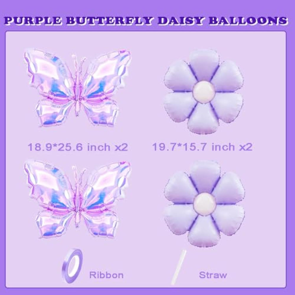 | ?Butterfly Daisy Balloons?25.6*18.9 Inch Purple Butterfly Balloons *2; 19.7*15.7 Inch Purple Daisy Balloon *2; Ribbon *1; Straw *1 | | ?Helium Supported?No | | ?Applicable Scene?Suitable For Spring Party, Butterfly Party, Wedding, Birthday Party, Anniversaries, Baby Shower, Two Groovy Decorations Girl. | | ?Product Material?Our Balloons Are Made Of High-Quality Materials. They Can Be Reused, Preserved For A Long Time, And Are Not Prone To Bursting Or Fading. | | ?Tips?These Balloons Will Close Automati