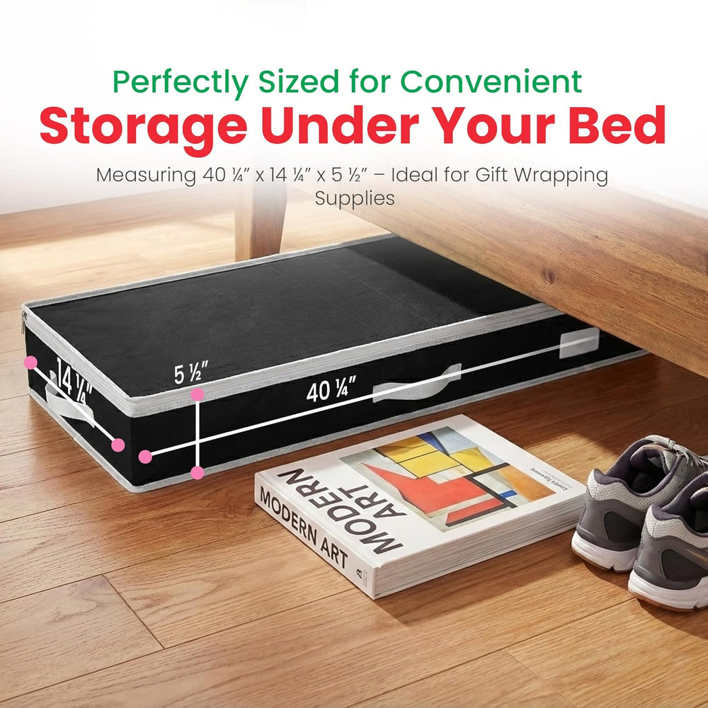 | Keep Gift Wrapping Supplies Organized: Store All Your Christmas And Gift Wrapping Supplies Gathered Neatly In One Place. | | Reduces Waste: No More Wrinkled Wrapping Paper With Torn Edges Or Ripped Bows; Keep All Your Supplies In Perfect Condition With This Storage Organizer. | | High Quality: Durable Construction That’S Made To Last, Reuse The Organizer Again And Again, Year After Year. | | Large Capacity: Two Deep Pockets, Room For At Least Eight Large Rolls Of Wrapping Paper And Still Plenty Of Space For Ribbons, Bows, Tape, Scissors And Other Supplies. | | Easy Under Bed Storage: The Gift Wrap Storage Organizer Measures 40 ¼” X 14 ¼” X 5 ½”, Designed For You To Conveniently Save Storage Space By Simply Slipping It Under The Bed. | |