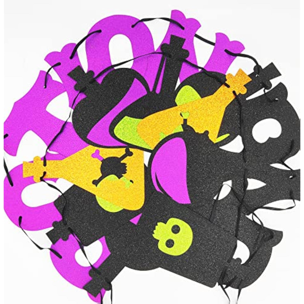 Halloween Potion Bar Banner – Bring fun and festive vibes to your Halloween potion bar party with this pre-assembled glittery banner set. The package includes one black and purple glitter “POTION BAR” banner with potion signs and a second colorful glitter potion pattern banner. Each letter measures approximately 5.9" high, potion signs 6.3", and the banner strings are 3 meters (9.8 ft) long. Made from high-quality glitter cardstock with black satin ribbons, it’s ready to hang on mantles, walls, ceilings, cake tables, trees, or doors. Perfect for Halloween potion bar parties, witches’ Hocus Pocus themes, haunted houses, or mantle decorations, it adds a playful and magical touch without any DIY required.