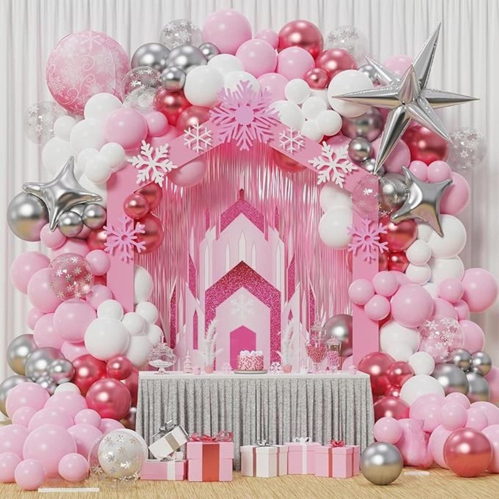 This Balloon Arch Kit includes 41 pink balloons, 41 white balloons, 30 metallic red balloons, 30 metallic silver balloons, 10 snowflake latex balloons, 4 foil balloons, a balloon arch strip tape, and a roll of 100 glue dots. Made from natural, non-toxic latex, the balloons are safe and durable. Perfect for a variety of occasions, including princess birthday parties, snow-themed events, winter wonderland parties, and Christmas celebrations, this kit also serves as a beautiful backdrop for indoor or outdoor photo shoots. Easy to assemble, the included tools allow you to DIY any style of balloon arch, providing a fun and creative activity for family and friends.