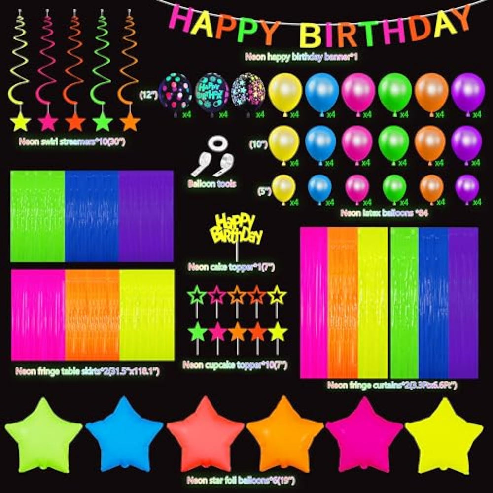 | All Glowing Kit In One - Includes 1 Happy Birthday Neon Banner, 1 Cake Topper, 10 Star-Shaped Cupcake Toppers (5 Solid/5 Hollow), 84 Multicolor Latex Balloons, 6 Foil Star Balloons, 1 Glowing Spiral Star Swirl, 1 Fluorescent Tinsel Curtain, 1 Fringe Table Skirt, 1 Set Balloon Tools. | | Exclusive Glowing Layers - Match Fluorescent Tinsel Curtains With Fringe Table Skirt, Creating Dimensional Lighting Effects Under Uv Without Extra Decor, Encase Rooms In 360° Neon Ambiance. | | Professional Balloon Arch Builder - Our Packages Include Latex Balloons In Different Colours And Sizes, So You Don'T Need To Buy Them Separately. Each Package Includes Three Balloon Tools That Will Help You Build The Perfect Arch! | | Instant Glow Zone Setup - Pre-Cut Streamers With Reinforced Edges Resist Tearing. From Spiral Ceiling Hangings To Dual-Texture Cupcake Toppers, Our Star Designs Create Visual Harmony Across All Decor Elements. | | Multi-Age Celebration Essential - Fluorescent Party Pack Suit For Teens' Glow Parties, Adult Neon Nights, Gender Reveals, Rave Events, And Blacklight Birthday Bashes. | |
