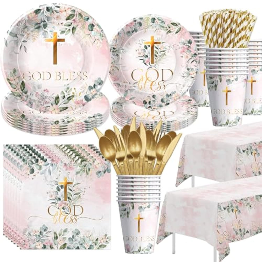 | ?First Communion Table Decorations? Featuring Delicate Pastel Colors, Crosses, And Beautiful Floral Patterns, This First Holy Communion Decorations Party Tableware Set Adds A Touch Of Grace And Charm To Any Celebration, Making It Perfect For Religious Events, Baptisms, First Communions, And Christenings | | ?Complete Set?Our Pink Baptism Decorations For Girls Come Complete With All The Essentials For A Seamless Party Experience Including 24Pcs 9'' First Communion Dinner Plates, 24Pcs 7'' God Bless Dessert Plates, 24Pcs Paper Napkins, 24Pcs Paper Cups, 24 Sets Of Disposable Cutlery, 24Pcs Paper Straws, 2Pcs First Communion Tablecloth. For Girl'S Baptism Decorations | | ?Versatile Use?God Bless 1St Communion Decorations Party Supplies Dinnerware Ideal For Girls' Religious Celebrations, The Elegant And Versatile Design Suits A Variety Of Other Special Occasions, Such As First Communions, Baby Shower Confirmations, Baptism, Easter, Christmas, Church Gatherings, Mi Bautizo Sage Leaves Parties, And Religious Parties, Adornos Para Primera Comunión | | ?High-Quality Materials?Crafted From Premium Materials, This Girl Baptism Party Supplies Dinnerware Set Ensures Practicality And Longevity. The High-Quality Construction Makes It Suitable For Serving A Variety Of Party Treats And Withstands The Rigors Of Lively Celebrations | | ?Convenient Disposable Design?Perfect For A Hassle-Free Cleanup, Our God Bless Party Supplies Tableware Allows You To Focus On Enjoying The Party Without Worrying About Washing Dishes Afterward, Making It Ideal For Both Indoor And Outdoor Celebrations | |