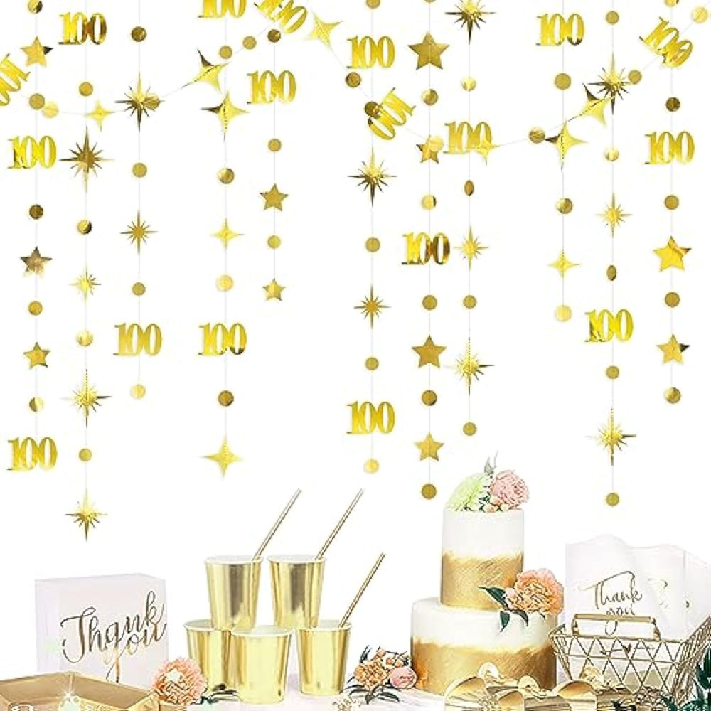 Package Includes: 4 Strings Of 11.5 Feet/3.5 Meters Gold Number 100 Sparkling Twinkle Star And Circle Dots Garlands , Totally Is 46 Feet/14 Meters. | Environmental Material: Our Gold 100Th Birthday Decorations / Happy 100 Days Celebration Birthday Anniversary Garland Are Made With High Quality Double Sided Metallic Paper Cardstock, Carefully Hand-Made And Connected With Thread, Durable And Reusable In Nice And Bright Colors. | Adorable Party Decor: The Gold Number 100 Circle Dot Twinkle Star Garland Kit Is Perfct For Mens/Womens 100Th Birthday Party, Happy 100 Days For Baby, 100Th Birthday Decorations,100Th Birthday Party Supplies, Baby'S 100 Days Celebration,Beers And Cheers To 100 Years Party, 100 And Fabulous Birthday Decorations For Women, Im 100 Bitchs Party, 100Th Anniversary, Wedding, Bridal Shower, Birthday, Engagement, Barbecue, Home, Christenings, Fetes, Etc. | Easy To Assemble: Unravel The Entire String And Hang It Up With Care To Avoid Twist. Our Star And Circle Dot Garlands With Figure 100 Can Be Cut To Different Lengths. Just Hang It On The Walls,Windows, Gift Tables, Dessert Tables, Fences, Tree Branches, Hallway And Other Indoor And Outdoor Places You Like. | Product And