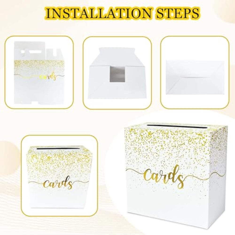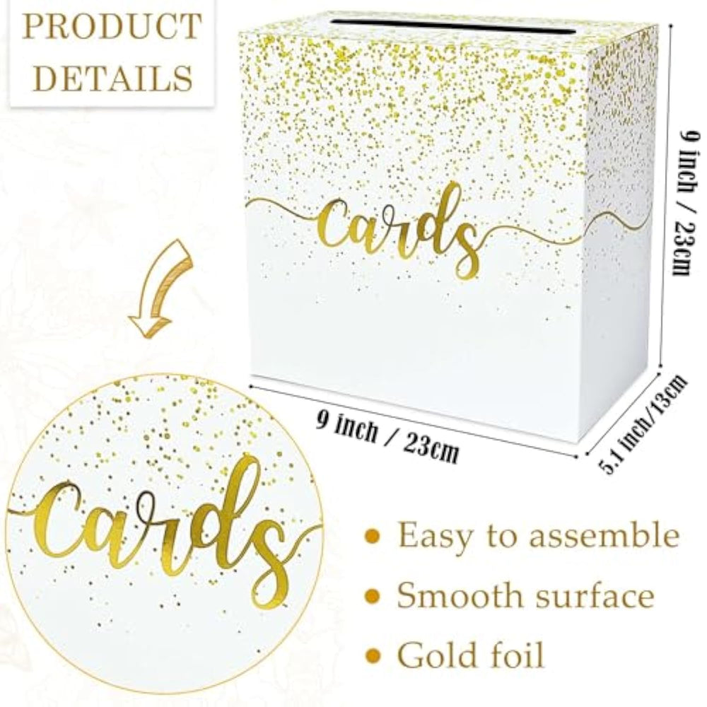 | Gold Card Box: Our Card Box Holder For Party Is 9 X 5 X 9 Inch / 23 X 13 X 23 Cm. The Large Capacity Gift Card Box Holder Is Enough To Hold The Envelope Cards For Wedding Or Party. | | Thick Card Box: The Card Box For Wedding Made Of High Quality Cardboard, Which Is Thick And Durable. The Wedding Card Box Is Easy To Assemble, You Can Assemble It Easily And Quickly. | | Gift Card Box: The Gold Foil Card Box Can Be Diy What You Want, You Can Paint Or Stick Some Flowers, Which You Can Create Your Own Style Card Box. White Raffle Box With Gold Foil Can Be Used In Any Scene. | | Card Box For Party: The Envelope Box Can Be Used For Wedding, Retirement, Baby Shower, Birthday, Bridal Shower And Any Theme Party, And It Can Also Used As Ballot Box, Raffle Box And Advice Box. Decorating Raffle Ticket Box On Your Wedding Or Party Will Add More Elegance. | | Afeter-Sales Service: If The White Card Box With Gold Foil For Baby Shower Have Any Quality Problem And You Are Not Completely Satisfied, Please Feel Free To