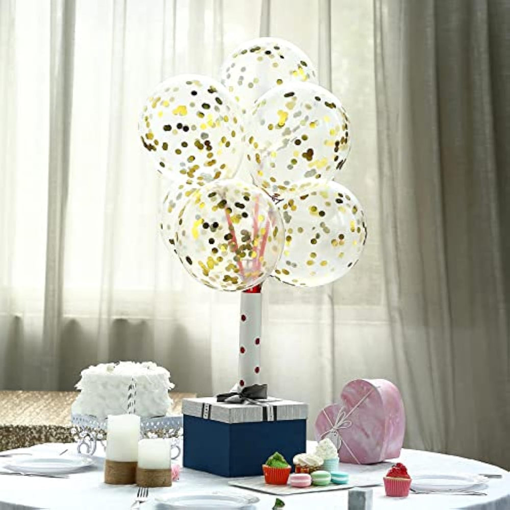 Add a touch of sparkle to your celebration with this 60-Pack Gold Confetti Balloon Set! Each 12-inch latex balloon is pre-filled with shiny gold paper confetti, and the kit includes a 33-ft gold ribbon for added flair. Made from premium eco-friendly latex, these balloons are durable, non-toxic, and safe for kids. Perfect for birthdays, weddings, graduations, bridal showers, and more—indoors or out. Inflate with air or helium (floats up to 12+ hours with helium). For best results, rub the balloons with a dry towel to help the confetti stick to the sides for a stunning effect.