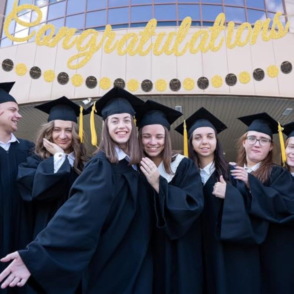 | Celebratory Banner Set For Prom Graduation: This Set Includes A Pre-Strung Gold Glitter "Congratulations" Banner Paired With A Black And Gold Glitter Circle Garland—Perfect For Class Of 2025 Graduation Parties, Prom Nights, Retirements, Engagements, Baby Showers, Or Any Milestone Celebration. | | Glitter Cardboard Banner: Made From High-Quality Glitter Cardboard, The Banner Shines Beautifully Under Lights, Adding An Elegant And Festive Feel To Your Event Space And Making Your Celebration Even More Memorable. | | Easy To Hang And Set Up: Both The Banner And Garland Come Pre-Strung, Ready To Hang Right Out Of The Package. Simply Display Them On Walls, Windows, Photo Backdrops, Or Tabletops—No Tools Or Assembly Required. | | Eye-Catching Design: The Glittering "Congratulations" Text And Alternating Black And Gold Circle Garland Instantly Grab Attention And Elevate Your Party Décor. Each String Measures Approximately 9.8 Feet In Length, Providing Ample Coverage For Most Party Settings. | | Ideal For Many Celebrations: Ideal For A Wide Range Of Events Including Prom, Graduation (Class Of 2025), Retirement, Job Promotion, Or Engagement Parties. This Banner Set Brings A Touch Of Celebration And Sparkle To Any Indoor Or Short-Term Outdoor Occasion. | |