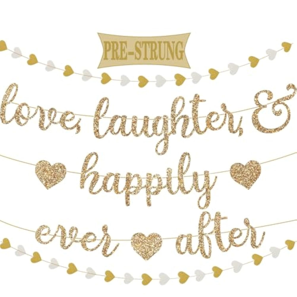 Skip the hassle of assembly with our pre-strung "Love, Laughter & Happily Ever After" banner—no DIY needed, just hang and go! It comes with two ready-to-use heart garlands (6.6 feet each, 18 hearts per strand) for a charming touch. Designed with trendy fonts, sparkling gold glitter, and fun ring accents, this banner adds a playful and elegant vibe to your bachelorette, bridal shower, or wedding celebration. Made from durable 350gsm cardstock, it's built to last and can be reused for future events. Perfect for decorating mantels, dessert tables, windows, or photo backdrops—wherever you want to add some sparkle and love!