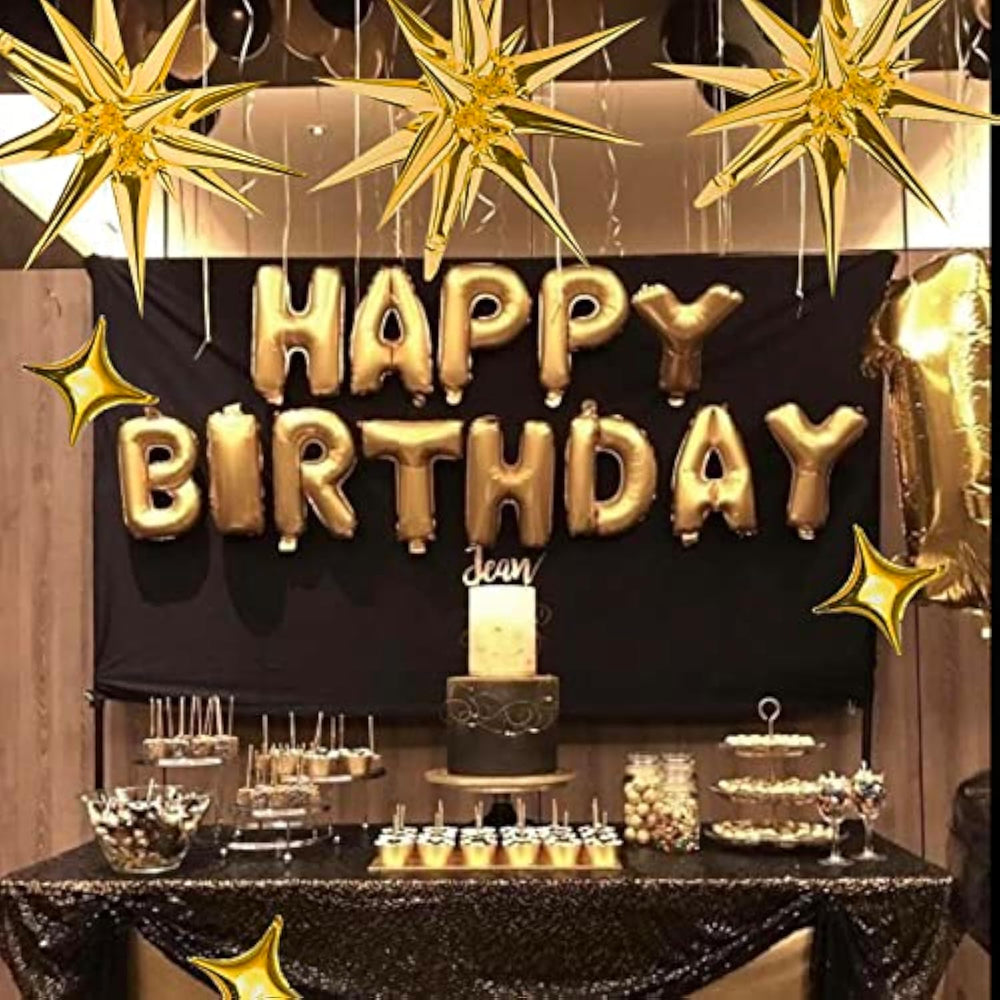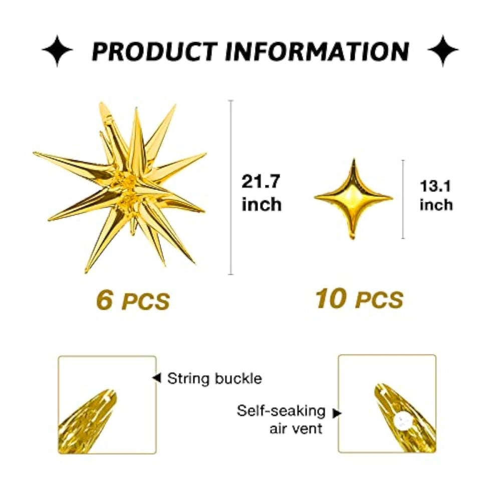 ?Package?You Will Get 6 Pack 21.7 Inch Explosion Star Balloons, 10Pcs 13 Inch Four Pointed Star Balloons, Very Elegant And Super Valuable. | ?Material?The Star Foil Mylar Balloons Are Made Of High Quality Foil, Which Is Sturdy And Durable.They Are Self-Sealing, Not Easy To Leak Gas Or Break During Inflating. They Can Last For Several Weeks After Being Inflated. | ?Adorable Design?These Gold Star Balloons Are Shining And Exquisite. They Are Designed In Different Shapes And Size To Satisfy Your Needs, They Can Be Used As The Photo Background Or Photo Props, Which Will Make Your Party More Delicate. Leaving Your Guests An Impressive And Unforgettable Memory. | ?Easy To Use?Our Star Balloons Are More Practical And Reusable. You Can Use A Straw Or Air Pump To Inflate The Balloons, Filling With Helium Will Allow The Spike Balloons To Float, Four Pointed Star Balloons Are Not Able To Float. You Can Also Use A Straw Inserted Into The Inflation Port To Deflate The Air Or Helium For Next Time To Use. | ?Wide Application?These Shiny Star Balloons Are Ideal For Baby Shower, Bridal Shower, Wedding, Anniversaries, Birthday Party, Graduation, Engagement ,Opening Events, Christmas Party And Other Indoor Or Out Door Events Background Decorations. Buy Now! You Will Enjoy It. |