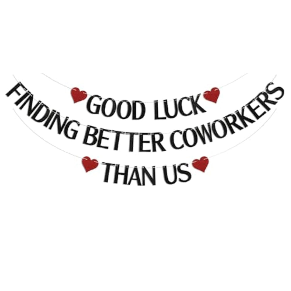 | ?? "Good Luck Finding Better Coworkers Than Us" Retirement Party Office Coworker Goodbye Banner In Glitter Black | | ?Our Banner Made With Black Premium Card Stock | | ??Letters Vary From 4 - 6 Inches Tall | | ??? Diy: The Banner Comes With Pre-Cut Letters And String And You Need To Assemble The Banner. | | ??Perfect For Mem/Women Office Coworker Leaving Retirement Party. | |