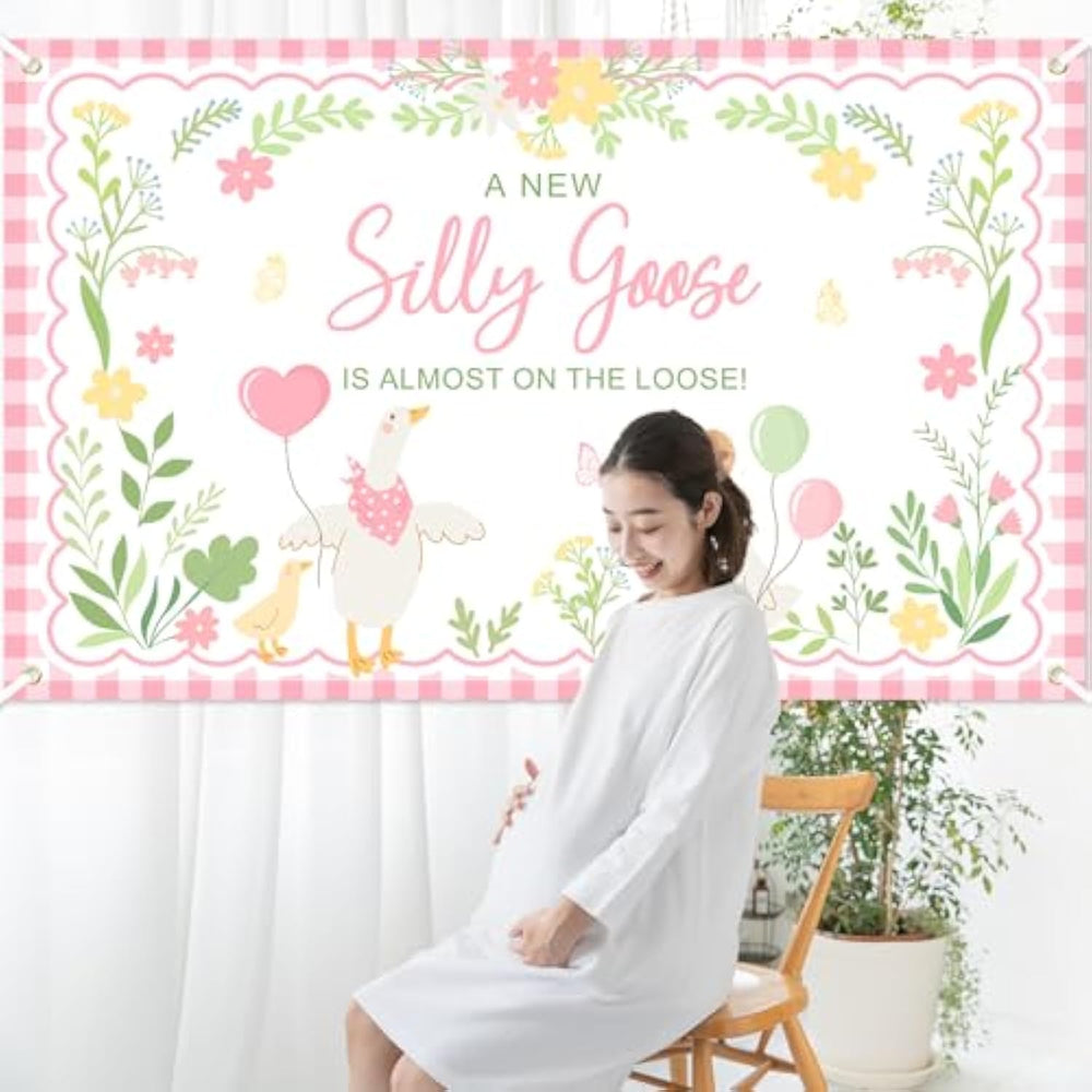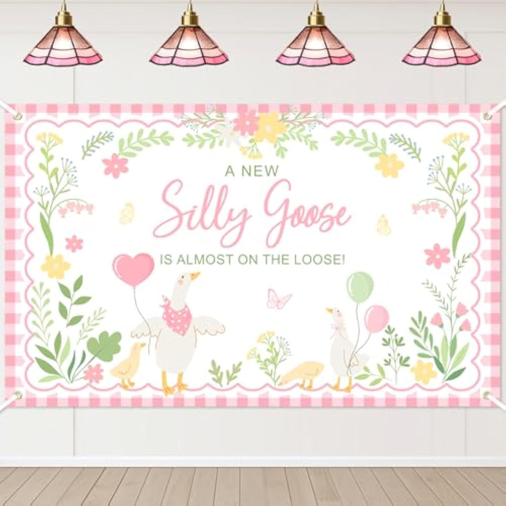 | Celebrate In Style: This Bright And Colorful Silly Goose Baby Shower Backdrop Banner Can Be Used As A Background For Childrens Baby Shower Party Decorations Scene And For You To Take Photos; Made Of High-Quality Polyester Fabric That Will Maintain Its Vibrant Colors Even After Repeated Use, With String For Easy Hanging | | Photo Banner Or Decor: 6 X 3.6 Ft (180 X 110 Cm), The One Silly Goose Banner Make A Stunning Decorative Addition To Your Home, As Indoor Outdoor Garden, Yard, Party Home Decorations | | Versatile Decor: Included Rope Along All 4 Corners Allows The Pink Goose Baby Shower Backdrop To Be Hung Horizontally Or Verti