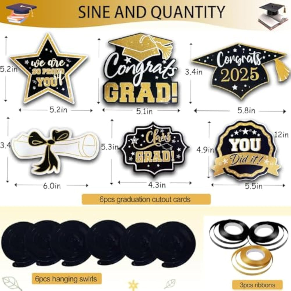 | ?2025 Graduation Decorations?: Package Includes 1 Congrats Grad Banner, 6×12Inch Black Graduation Balloons, 6×12Inch Gold Graduation Balloons, 6X12 Inch Gold Confetti Latex Balloons, 6 Pieces Graduation Hanging Swirl, 71×43 Inch Class Of 2025 Backdrop, Black Gold Cap Star Hanging Garland, 12 Pcs Graduation Cupcake Toppers, One Golden Ribbon And Two Black Ribbons, Celebrate Your Graduation In Style With These Graduation Decorations Kit! | | ?Widely Use?: Graduation Party Decorations, Suitable For Indoor And Outdoor Use, Can Also Decorate Walls And Dining Tables. Graduation Decoration 2025 Is Perfect For Your Party, Home, Kindergarten, Elementary School, Middle School, High School, And College Graduation Party Decorations And Any Other Place Where You Want To Attend Graduation, Which Will Adding A Festive Atmosphere To Your 2025 Graduation Party Supplies Event. | | ?Safe Durable?: These Graduation Decorations 2025 Are Made Of Sturdy Card Materials, With Surface Lamination And Clear Printing Technology, Which Is Not Easy To Bend. Each Balloon Is Carefully Selected And Can Be Used Safely. Our Products Are Always Exactly The Same As Described. Which Let Many Consumers Rest Assured. | | ?Easy To Assemble?: The 2025 Graduation Decorations Is Very Easy To Assemble, Adjust Different Heights And Lengths According To Your Preferences. Graduation Banner, Graduation Balloon, Graduation Wreath, Spiral, Graduation Aluminum Film Balloon, Freely Mix And Match To Your Favorite Combination. Assemble Them Effortlessly And Surprise Everyone With Your Decorations. It'S Time To Celebrate. | | ?Easy To Assemble?: The 2025 Graduation Decorations Is Very Easy To Assemble, Adjust Different Heights And Lengths According To Your Preferences. Graduation Banner, Graduation Balloon, Graduation Wreath, Spiral, Graduation Aluminum Film Balloon, Freely Mix And Match To Your Favorite Combination. Assemble Them Effortlessly And Surprise Everyone With Your Decorations. It'S Time To Celebrate. | |