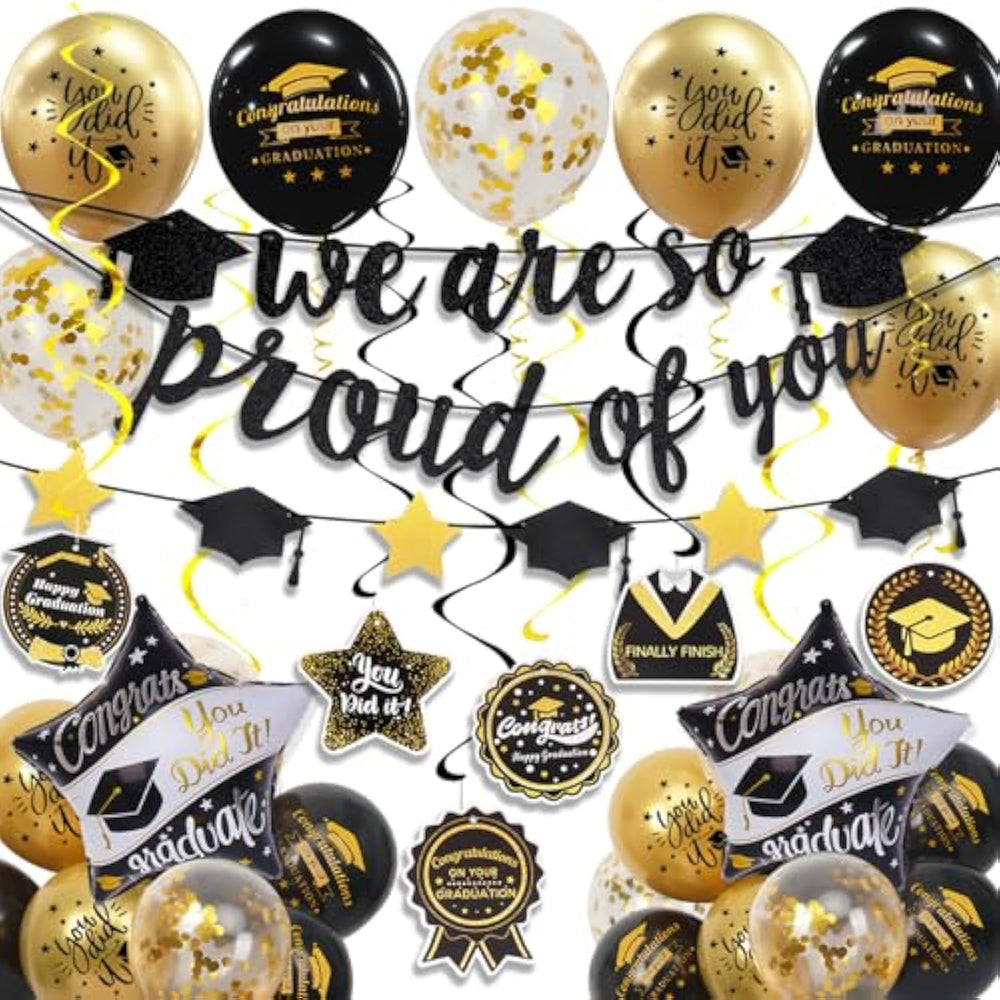 | ?Package Includes?: 1Pcs We Are So Proud Of You Banner, 6Pcs 12Inch Black Graduation Balloons, 6Pcs 12Inch Gold Graduation Balloons, 6Pcs 12Inch Gold Confetti Balloons, 6Pcs Graduation Cutout Cards With 6Pcs Hanging Swirls, 2Pcs 18Inch Graduation Foil Star Balloons, 1Pcs Black Gold Cap Star Hanging Garland, 1Pcs Golden Ribbon And 1Pcs Black Ribbons, Celebrate Your Graduation In Style With These Graduation Decorations Kit! | | ?Widely Use?: Graduation Decoration 2025 Is Perfect For Your Graduation Party, Kindergarten, Elementary School, Middle School, High School, College Graduation Party Decorations And Any Other Place Where You Want To Attend Graduation, It Can Be Hung On Ceilings, Walls, Table Backgrounds, Doorways, Fireplaces, Etc. | | ?Graduation Decorations?: The Graduation Decorations For The Class Of 2025 Are Essential For Any Graduation Ceremony, Instantly Enhancing The Ambiance And Making The Event More Memorable. The Graduation Decorations Kit And Centerpiece In Black And Gold Are Visually Striking, Decorations To Make The Graduation Party More Atmospheric. | | ?High Quality Material?: The Hanging Swirls Are Made Of Metallic Foil, Safety And Durable. The We Are So Proud Of You Banner And Themed Cutouts Are Made Of Card Stock, Super Thick And Hard, Not Easy To Bend, Can Be Reused. | | ?Note?: Please Do Not Overfill The Balloon, Avoid Sunlight, Overheating, Sharp Objects And Excessive Friction. | |