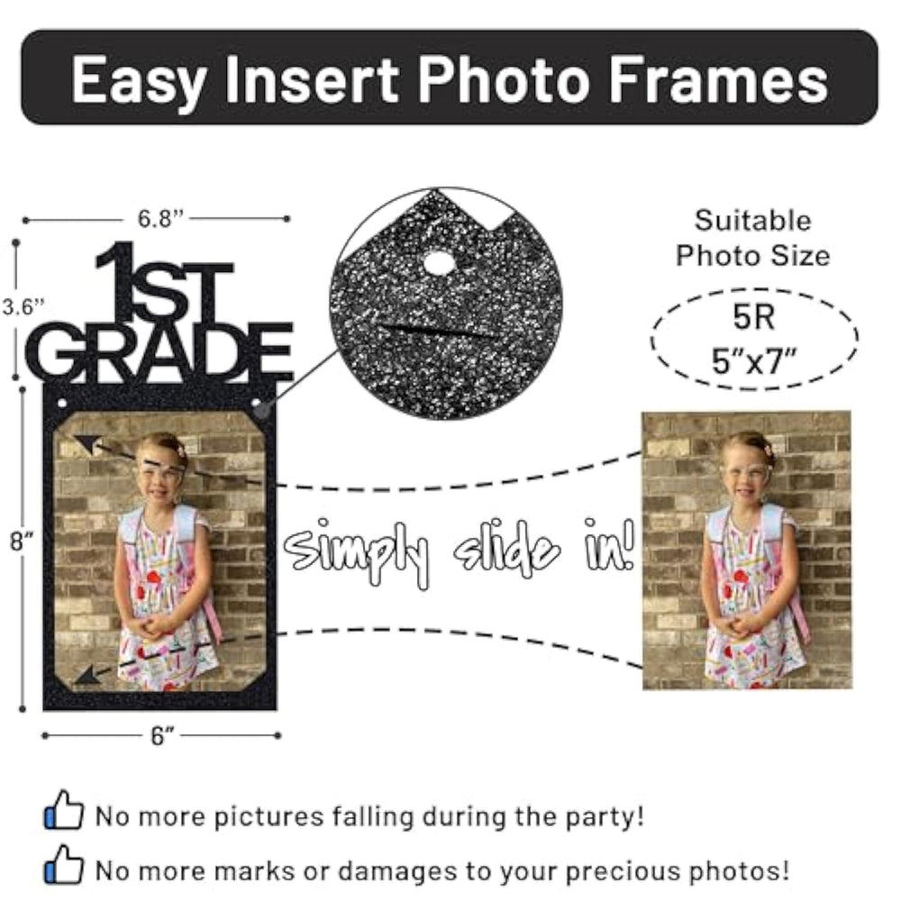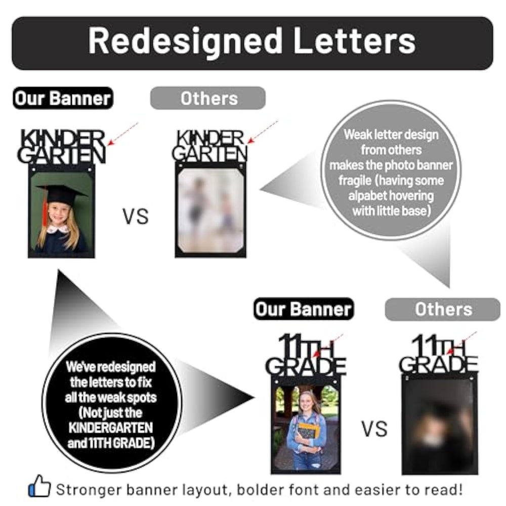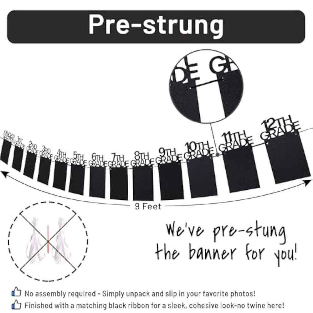 | Pre-Strung Banner – We Know Party Planning Can Be Stressful, So We’Ve Made It Easier For You! Unlike Others, Our K-12 Graduation Photo Banner Comes Pre-Strung. No Threading 26 Tiny Eyelets—Just Unpack, Insert Your Photos, And You’Re All Set! | | Matching Black Ribbons – We’Ve Strung It With A Sleek, Matching Black Ribbon For A Polished Look. Unlike Others, You Won’T Find Brown Twine In Your Package—Just A Cohesive, Classy Finish Ready To Impress! Ribbon Length Included 21Ft | | Redesigned Letters – We’Ve Fixed Flaws In Other Banners Like Fragile, Poorly Placed Letters. Their ‘T’ In ‘11Th Grade’ Sits On The Edge—Ours Doesn’T. No More Broken Or Missing Letters—Just Sturdy, Well-Designed Pieces You Can Trust. | | No More Damage To Your Precious Photos – Our Banner Has Secure Easy Insert Frames, So Just Slide In Your 5R (5"X7") Photos—No Glue Needed! Others Use Glue To Stick Photos On. Ours Is Safer, Cleaner, And Quicker For A Stress-Free Celebration. | | Higher-Quality Banner – Crafted With 300Gsm Cardstock, Our Banner Is Thicker And Sturdier Than The 200–250Gsm Paper Others Use. No Flimsy, Dull Material—Just A Polished, Glittery, And Durable Design Made To Impress At Your Celebration. | | Delivered Safely – Our Banner Is Securely Packed With A Protective Card To Prevent Bent Or Crumpled Edges During . Unlike Others, We Make Sure It Arrives In Perfect Condition—Ready To Shine At Your Celebration. | | Look No Further—This Is The Best Value Graduation Banner! With 5+ Years In The Party Industry, We’Ve Perfected Every Detail: Thicker Cardstock, Sturdy Letters, Matching Ribbon, Pre-Strung Banner, Built In Photo Frames, And Protective Packaging. | |