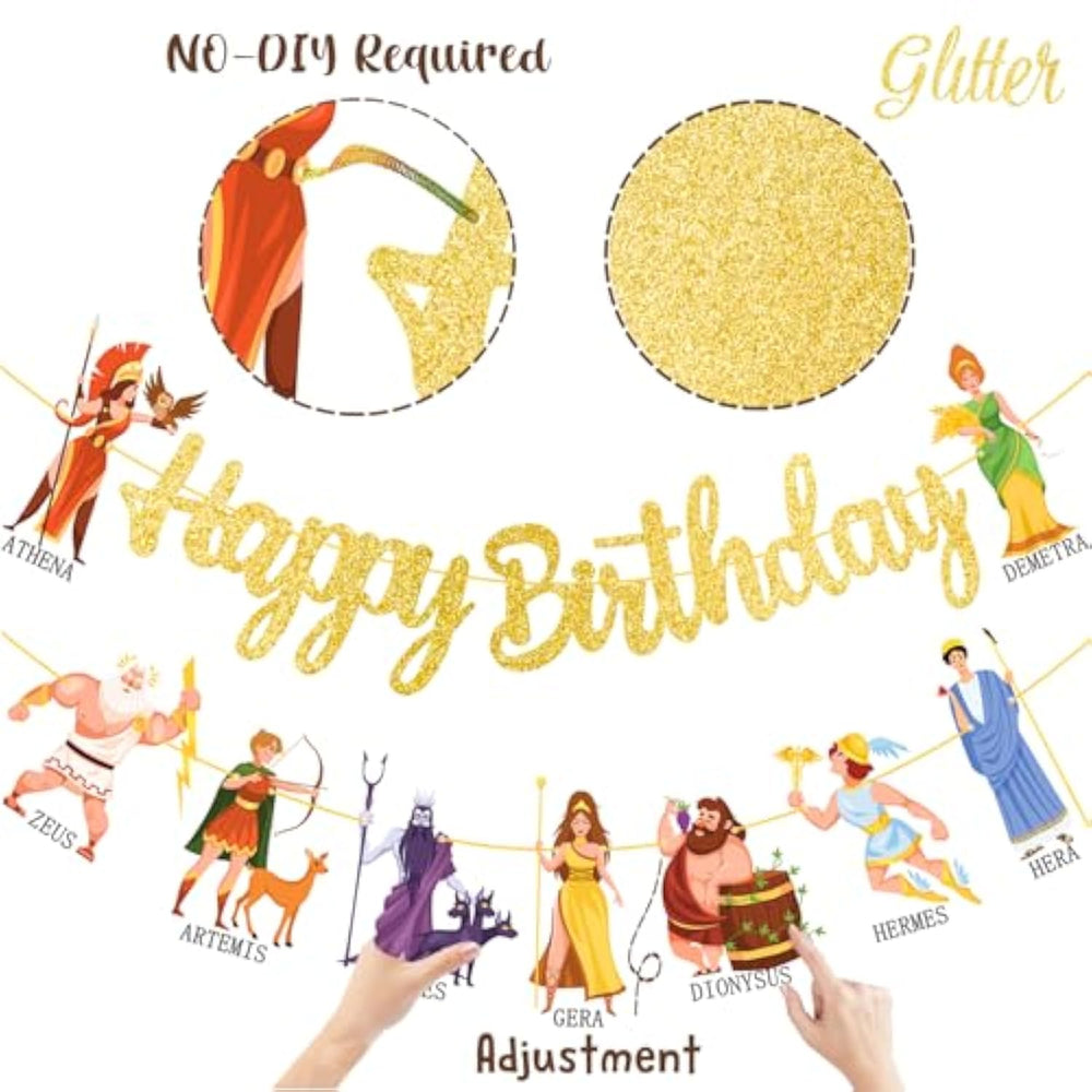 | Complete Set: Epic Greek Mythology Birthday Banners Feature Iconic Greek Gods And Goddesses Including Zeus, Poseidon, Hades, Aphrodite, And Others In Vibrant Cartoon Illustrations. Interesting And Fascinating | | Perfect Size: Each Greece Gods Banner Spans 9.8 Feet In Length. The Proper Size Greek Goddesses Character Cutouts Are Printed On Both Size Which Can Be The Highlight Of Your Ancient Greek Mythology Party | | Glittering Design: This Ancient Greek Birthday Decoration Includes 2Pcs Greek Gods Cutout Banners And 1Pcs Sparkling Gold Text Reading "Happy Birthday" With Letters Measuring Between 6.9 To 11 Inches In Size | | Versatile Decor: Ideal For Greek Mythology Birthday Celebrations, Greece Themed Parties, Classroom Decorations, And Educational Display. Fill Your Party With The Atmosphere Of Ancient Greek Culture | | Detailed Artwork: Each Deity Of This Greek Themed Banner Is Uniquely Illustrated With Their Signature Attributes - Zeus With Lightning Bolt, Poseidon With Trident, Artemis With Bow And Deer. Clear And Full Of Details | |