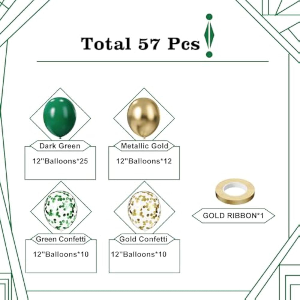 | ???Green And Gold Balloons Set Including?Total 57Pcs,12-Inch Dark Green Balloons*25,Gold Balloons*12,Gold Confetti Balloons*10,Green Confetti Balloons*10,Different Color Balloons Can Help You Create More Beautiful Party Decroations! | | ???Dark Green And Gold Party Balloons?Diy Beautiful Dark Green And Gold Confetti Balloon Arch, Garland, Wreaths Or Table Centerpiece. Dress Up Your Party,Use The Dark Green Balloons With Gold Confetti Balloons Make Kinds Of Balloon Decor, Photo Background Layout. | | ???Suitable For Various Occasion?Dark Green And Gold Balloons Perfect For Birthday Parties, Graduation Decoration, Baby Shower, Weddings, Anniversaries Celebrations, Jungle Party,Forest Theme Party,Other Big Event, Get A Big Hit And Create Lasting Memories With These Balloons Party Decoration. | | ???Easy To Use?Green And Gold Balloons Are Made Of Durable Latex Material, Non-Toxic And Durable. They Are Easy To Blow Up, Then Tie The End Of The Balloon With A Colourful Ribbon, You Can Use Your Creativity To Make The Balloon Have More Shapes. | | ???How To Make Confetti Balloon?The Confetti Balloons Are Pre-Filled Colorful Confetti Into Transparent Balloon, All You Need To Do Is Use A Pump To Quickly Inflate And Gently Rub The Balloon Use Hands Or On The Dry Towel Or Carpet To Get The Static Electricity, So That Confetti Are Easier To Be Stuck. If There Is Any Problem Of The Party Supplies, Please
