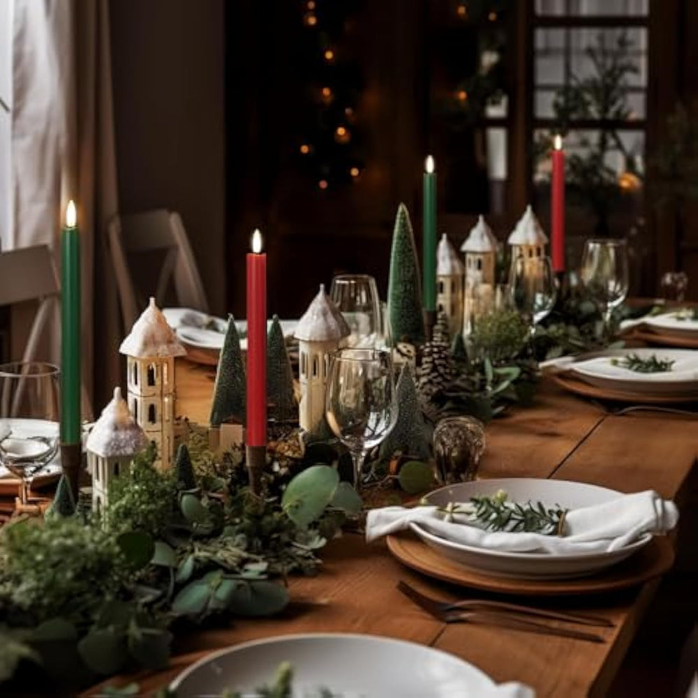| Convenient And Safe - Enjoy The Beauty Of Traditional Red And Green Candlesticks With The Convenience And Safety Of Battery Operated Led Candles. You Can Use Our Red And Green Candles Taper As Christmas Dinner Candles. There Is No Mess, No Wax To Clean Up. If You Are Concerned About Open Flames With Children And Animals, This Is A Safe And Lovely Alternative. | | Lifelike Flame - Forget Flat, Fake Flames! Our Red And Green Candle Sticks Feature Realistic 3D Flames With A Black Wick. The Warm White, Flickering Light Looks Just Like The Real Thing. | | Set The Mood: These Tall Tapered Candles Feature An Elegant Design That Is Suitable For Restaurants, Special Events And Christmas Parties. Their Classic Look Complements Almost Any Decor. | | 6 Red And Green Flameless Taper Candles And 1 Remote Control Together In One Kit. | Dimensions: 0.78" D X 10" H. Fits All Standard Taper Candle Holders And Candelabras. | | Remote Control And Battery Operated - Use The Included Remote Control To Switch From Steady Light To Flicker. You Can Also Adjust The Brightness. The 2 / 4 / 6 / 8 Hour Timer Setting Will Turn The Candles On And Off At The Same Time Each Day. Each Candlestick Is Powered By 2 Aaa Batteries (Not Included). | |