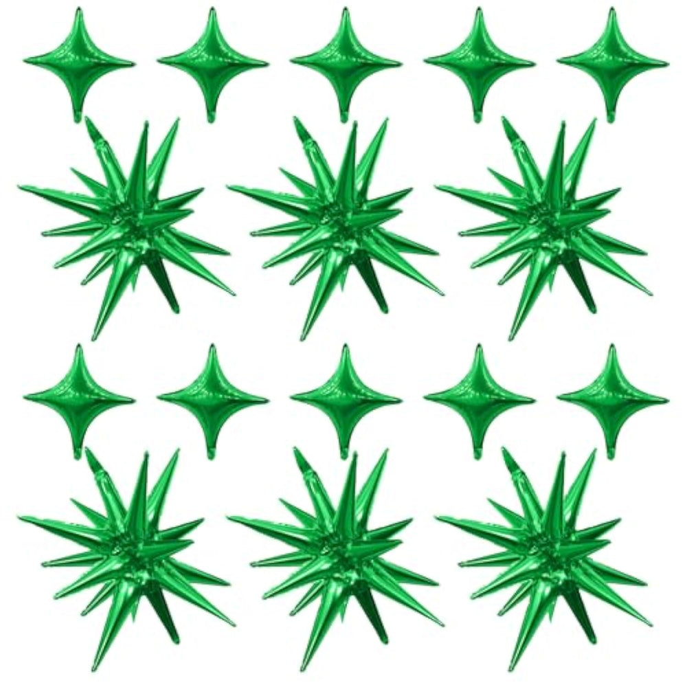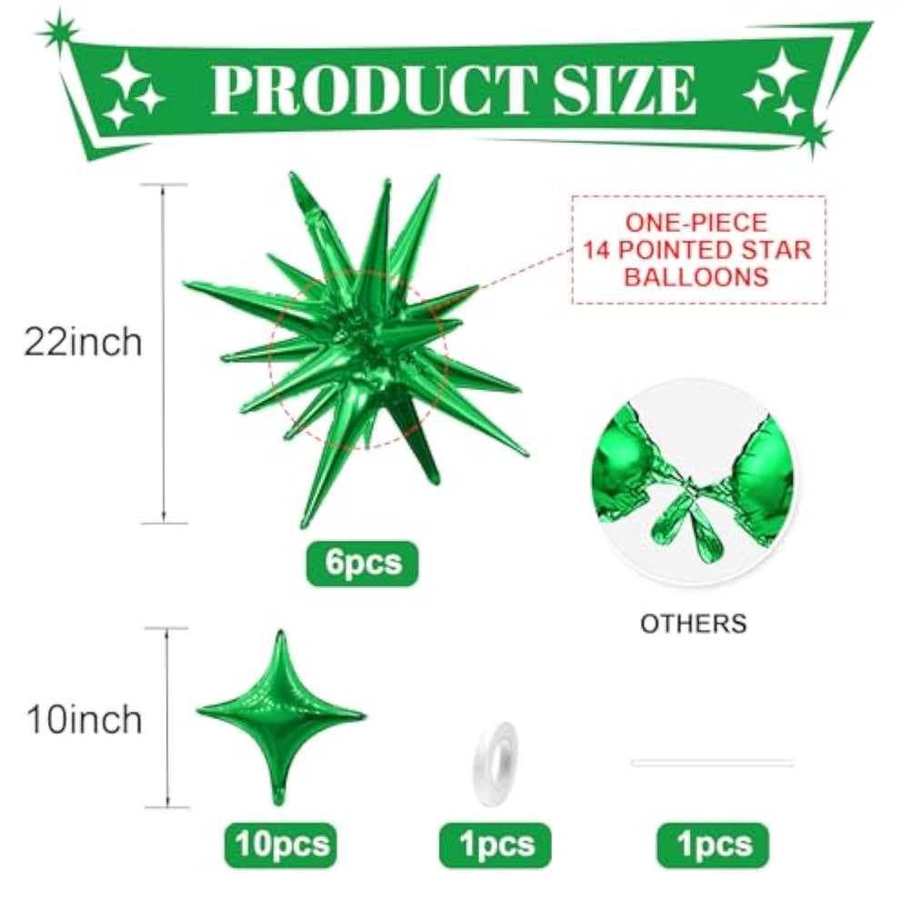Add a vibrant touch to your celebration with this Green Star Balloon Set, featuring 6 large 22-inch explosion star balloons and 10 smaller 10-inch four-pointed stars. Made from high-quality aluminum foil, these balloons are durable, brightly colored, and reusable, with no color fading or odor. Easy to inflate using the included straw, they support both air and helium and come with a self-sealing valve for hassle-free setup. Perfect for birthdays, anniversaries, graduations, baby showers, disco parties, and more—indoors or outdoors—this set is a stylish and convenient way to elevate any event.
