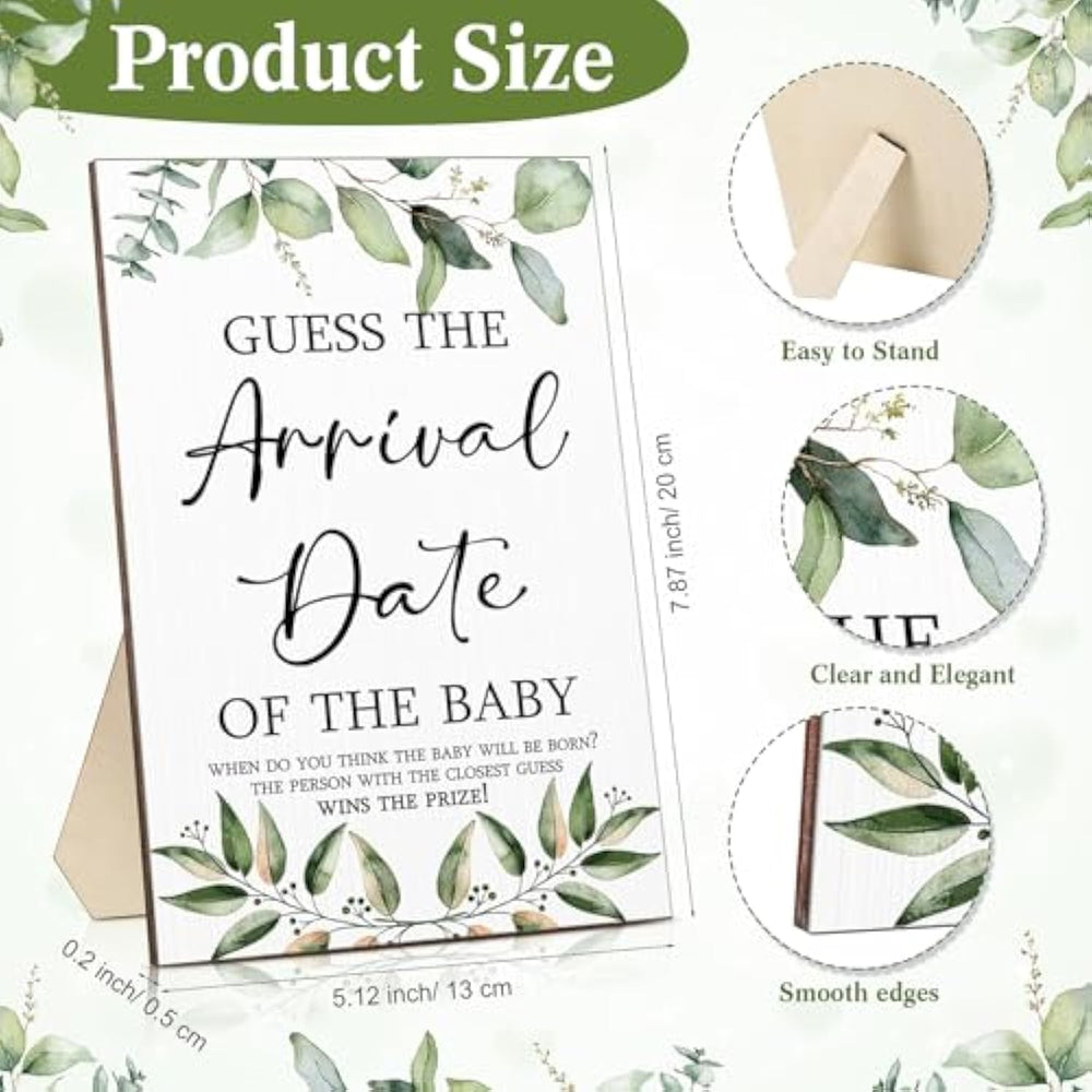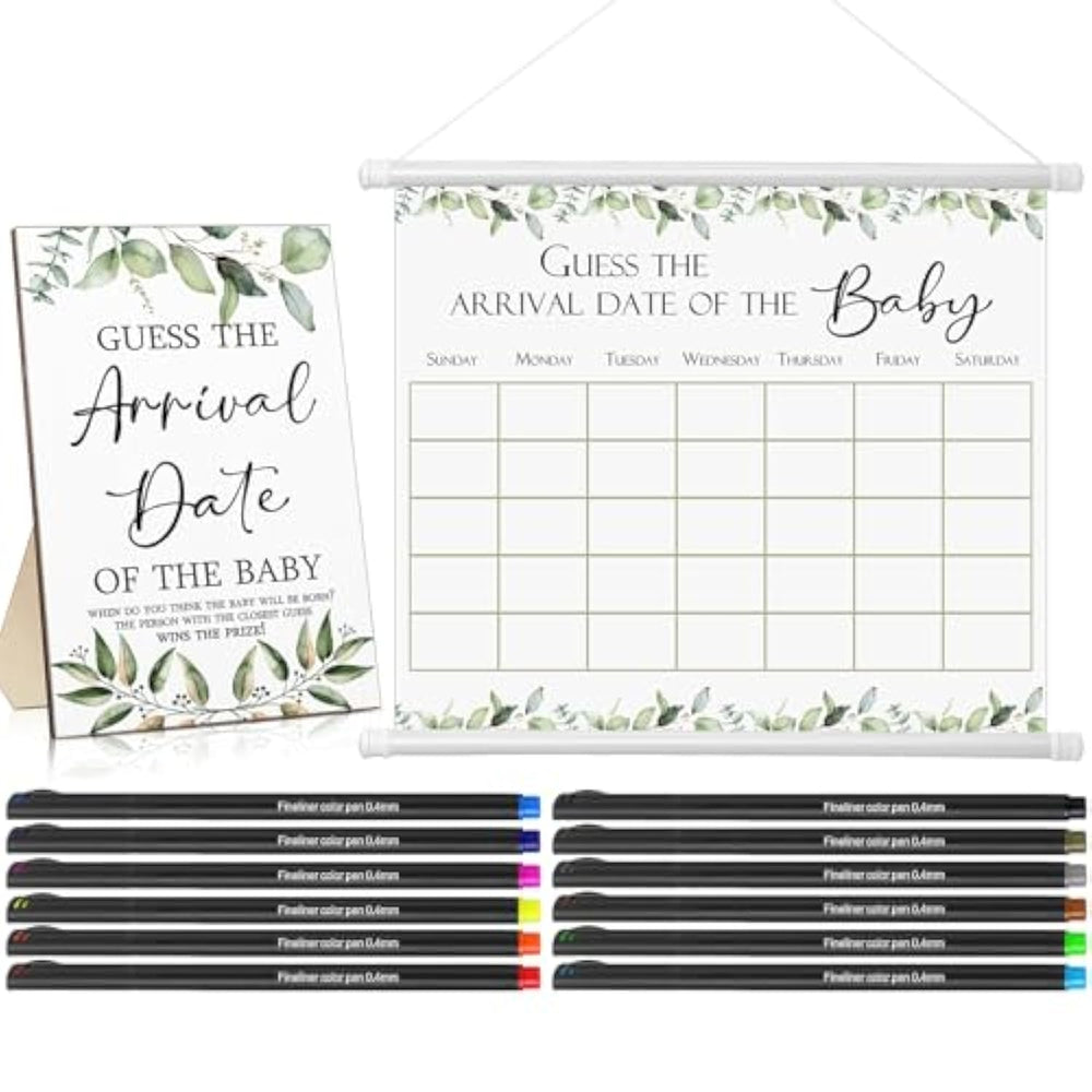| Guess The Due Date For Baby Game Set: You Will Receive 1 Piece Of Guess The Due Date For Baby Shower Calendar With 2 White Scrolls, 1 Piece Of Guess The Arrival Date Of The Baby Wooden Sign And 12 Pieces Of Color Pens; Nice Combination To Create An Unforgettable Party | | Quality Materiel: The Baby Shower Game Sign Is Made Of Wooden Material, Sturdy And Solid, There Is A Support Stand Behind The Sign, Which Can Stand Alone, Convenient For You To Place On The Table; The Guess The Due Date For Baby Shower Calendar Adopts Quality Cloth And Plastic Scroll, With Hanging Rope On The Top, Easy For You To Decorate | | Suitable Size: The Wooden Sign Measures About 5.12 X 7.87 X 0.2 Inches/ 13 X 20 X 0.5 Cm, The Due Date Prediction Calendar Is About 13.78 X 11.81 Inches/ 35 X 30 Cm (L X H), And The White Scroll Is About 15.35 Inches/ 39 Cm In Length, And The Colored Pen Is Approx. 6.18 Inches/ 15.7 Cm, Proper Size For Decorations And Uses | | Exquisite Design: Our Baby Predictions For Baby Shower Game Set Is Designed With Adorable Green Leaves Elements, Exquisite And Interesting, Make Your Parties Leave Deep Impressions On Your Guests | | Wide Application: Our Guess The Due Date For Baby Shower Calendar Set Is Mainly Suitable For Baby Shower Party, Gender Reveal And Other Occasions, Not Only Decorate Your Party, Add Festive Ambiance To Your Party, But Also Share Your Love And Joy With Your Family And Friends | |