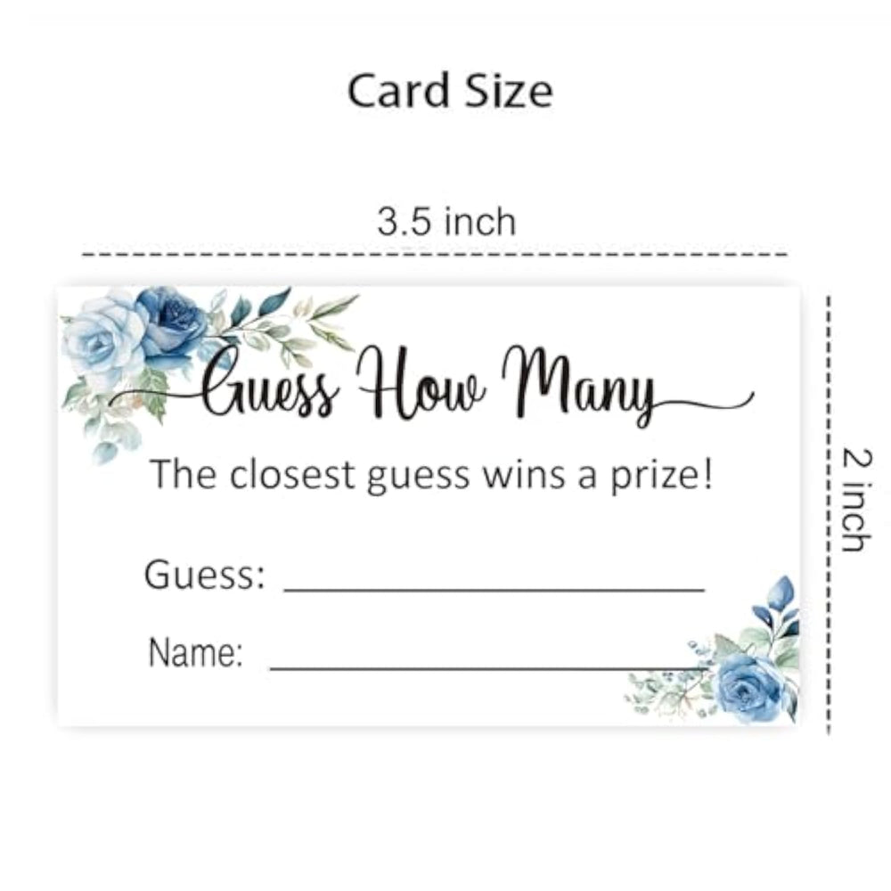 | Packing Include: 50 Guess How Many Game Cards. | | Perfect Size: Cards Measure 3.5" X 2" (Standard Business Card Size) | | High Quality Materia: Printed On High Quality, Premium Cardstock For Easy Writing With Pens, Pencils Or Anything You Choose, Easy To Write On, And Won'T Bleed Through. | | Various Applications: Welcome To Game, Game Cards, Simple And High-End Design. The Guess How Many Game Cards Clearly Print The Words, 'Guess How Many' And 'The Closest Guess Wins A Prize!' Perfect Cute Game For Baby Showers, Birthday Parties, Bridal Showers, Weddings, School Events And More. | | Style Design: Cards Features A Exquisite Design, The Back Is Blank For Additional Notes! Invite Your Guests To Write Their Guess As To How Many Candies Or Other Fun Items Are In The Jar Or Bottle In The 'Guess' Area And Their Name In The 'Name' Area To Win A Prize! | |