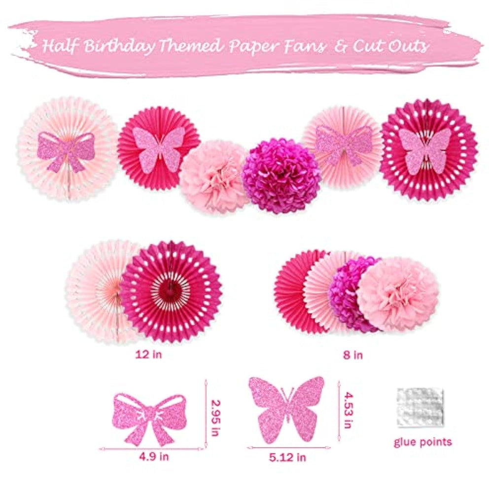 Half Birthday Decorations Baby Girl Include - 1Pc Pink Happy 1/2 Birthday Banner, 1Pc Pink Triangle Flags, 1Pc Pink Halfway To One Cake Topper, 6Pcs Light Pink/Hot Pink Paper Fans Or Pom Poms In Different Sizes, 4Pcs Bows/Butterfly Cutouts, 12Pcs 10β Pink/Light Pink/White/Rose Gold Confetti Balloons, 1Pc 1/2 Birthday Hat, 1Pc Pink Bow Tie, 1Pc Pink 1/2 Birthday Poster. Everything You Want Is In The Package? | Suitable For Various Occasions β Girls! LetβS Start The Shining Half-Life! This 1/2 Birthday Decorations Party Decorations Kit Is Suitable For Girlsβ Half Birthday Party, Little Girl 1/2 Birthday Party, Half A Year Birthday Party, Baby Bath Party, 6 Months Birthday Party For Baby Girl And All Over Party. Use Your Imagination And Put It In More Situations. | Premium Quility β The Half Birthday Banner Is Made Of Top-Quality Glittered Card Stock That Is Durable And Strong And Always Attached To Brand New Food-Safe Toothpicks Or Lollipop Sticks. Our Balloons Are All Made Of High-Quality Natural Latex, Which Is Clean, Safe And Durable. | Quick Easy To Assemble - The Half Birthday Banner Needs To String, Simply Unfold And Hang. Sticks And Dot Glue Included To Make Cute Halfway To One Cake Topper And Can Help You Decorate Paper Fans With Our Super-Cute Cut Outs. Do Not Over-Inflate The Balloons. It Is Recommended To Use A Balloon Pump. Avoid Sunlight, For Outdoor Event, Please Pre-Inflate All Balloons Indoor Prior To Event. | Half Birthday Theme Design - These 6 Months Party Decorations Supplies Kit Are Designed With Beautiful Bow/Butterfly/Star Elements, Pink Paper Fans And Pom Poms Can Hang On The Wall, Window, Door, Ceiling, And Other Places You Want By Diy, Cute 1/2 Birthday Party Decorations Will Make Your Party Joyful And Attractive. |