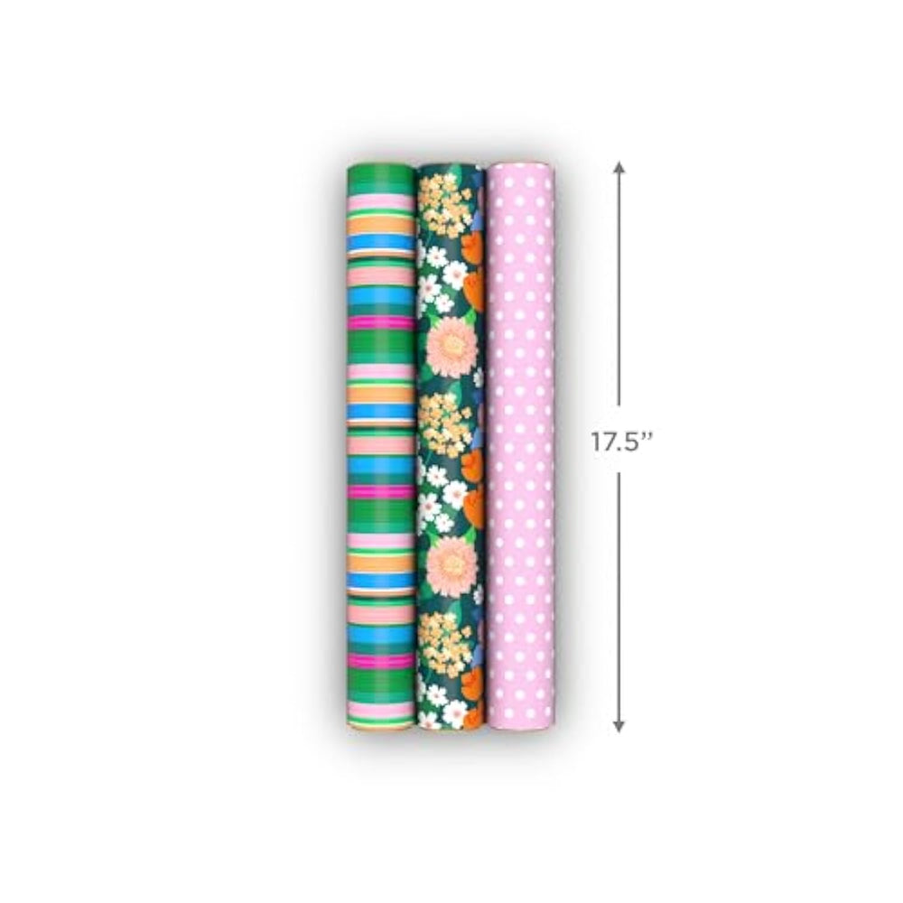 3 MINI ROLLS: Short rolls of wrapping paper each measure approximately 17.5 inches wide by 10.2 feet long for a total of 15 square feet; 45 square feet in the set | PRETTY DESIGNS: Elegant rolls of gift wrap feature 3 unique designs: Blush pink with white polka dots, sophisticated flowers and thin stripes in pink, peach, blue, green and yellow; perfect for bridal showers, weddings, birthdays, and Mother's Day | EASY STORAGE: Mini rolls of wrapping paper take up less space and are easier to store than standard-size rolls, without sacrificing square footage; great for wrapping smaller gifts with less waste, too | CUT LINES ON BACK: Rolls of premium wrapping paper feature grid lines on the reverse side for straight cutting and perfectly wrapped presents | HIGH QUALITY: Crafted from high-quality paper materials, Hallmark's gift wrap supplies are made with paper from responsibly managed forests |