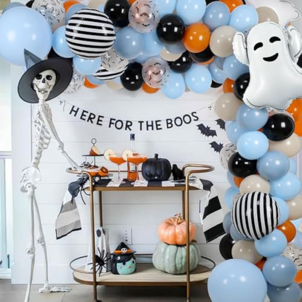 Celebrate your little one in spooky style with this Halloween Baby Shower Party Decorations set, perfect for Halloween-themed baby showers, boys’ 1st, 2nd, or 3rd birthdays, and fun “Happy Boo Day” celebrations. This complete set includes a large Halloween ghost foil balloon, black-and-white striped foil balloons, 3D PVC bat stickers, clear bat balloons, latex balloons in multiple sizes, glue, and a balloon arch, providing everything you need for a festive and playful setup. Unlike traditional Halloween décor, the retro color palette of blue, burnt orange, and sand white adds a unique and eye-catching touch, making any party unforgettable. Crafted from high-quality, durable materials, these balloons and decorations are resistant to bursting, ensuring safe and long-lasting fun. For best results, inflate slowly using an electric air pump to 85% capacity to create a stunning, hassle-free Halloween celebration for your little one.