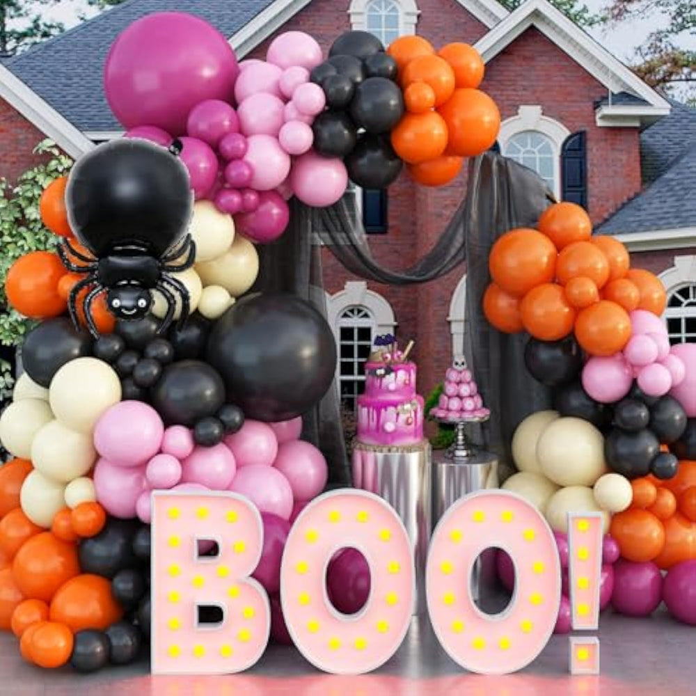 This Halloween Balloon Garland Kit includes a mix of 18-inch, 12-inch, and 5-inch latex balloons in black, retro hot pink, orange, pastel pink, and pastel yellow, along with a ghost, spider, and bat foil balloon, a balloon chain, and three dispensing tools. Perfect for creating a vibrant Halloween party backdrop, the color palette combines classic black and orange with fun pastel tones to add a playful twist to your décor. The kit comes with a full balloon strip for easy DIY assembly, making it simple and enjoyable to craft a garland with your family. Made from premium, non-toxic latex, these balloons are durable and resistant to bursting. They can be filled with air or helium and are ideal for indoor or outdoor Halloween parties, birthdays, weddings, and other celebrations, creating a memorable and eye-catching display.