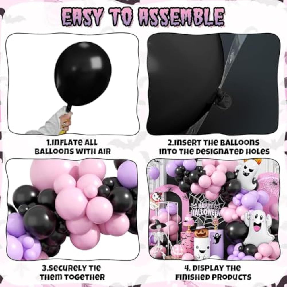 The Halloween Balloon Arch Garland Kit includes 2×18-inch balloons (Black1, Pink1), 24×12-inch balloons (Black8, Pink8, Retro Purple8), 30×10-inch balloons (Black10, Pink10, Retro Purple10), 37×5-inch balloons (Black15, Pink15, Retro Purple7), 2 unique foil balloons (ghost with raised hands1, pumpkin ghost*1), 1 balloon chain, 3 dispensers, and 1 pink ribbon. Featuring bold black, pink, and purple colors with eye-catching skull and ghost designs, this kit is perfect for creating a festive Halloween atmosphere at any party or home. Made from natural, eco-friendly latex, the balloons are safe for all ages—inflate to 90% to avoid bursting. Assembly is simple with the included tools, balloon chain, ribbon, and dispensers, allowing anyone from beginners to seasoned decorators to create a stunning Halloween arch or wreath in 30–60 minutes. Let your creativity shine by combining these balloons with other decorations to craft a fun and memorable setup with family and friends. For best results, avoid over-inflating balloons or exposing them to wind, sunlight, or sand; foil balloons can be filled with air or helium, but air-filled foil balloons will not float.