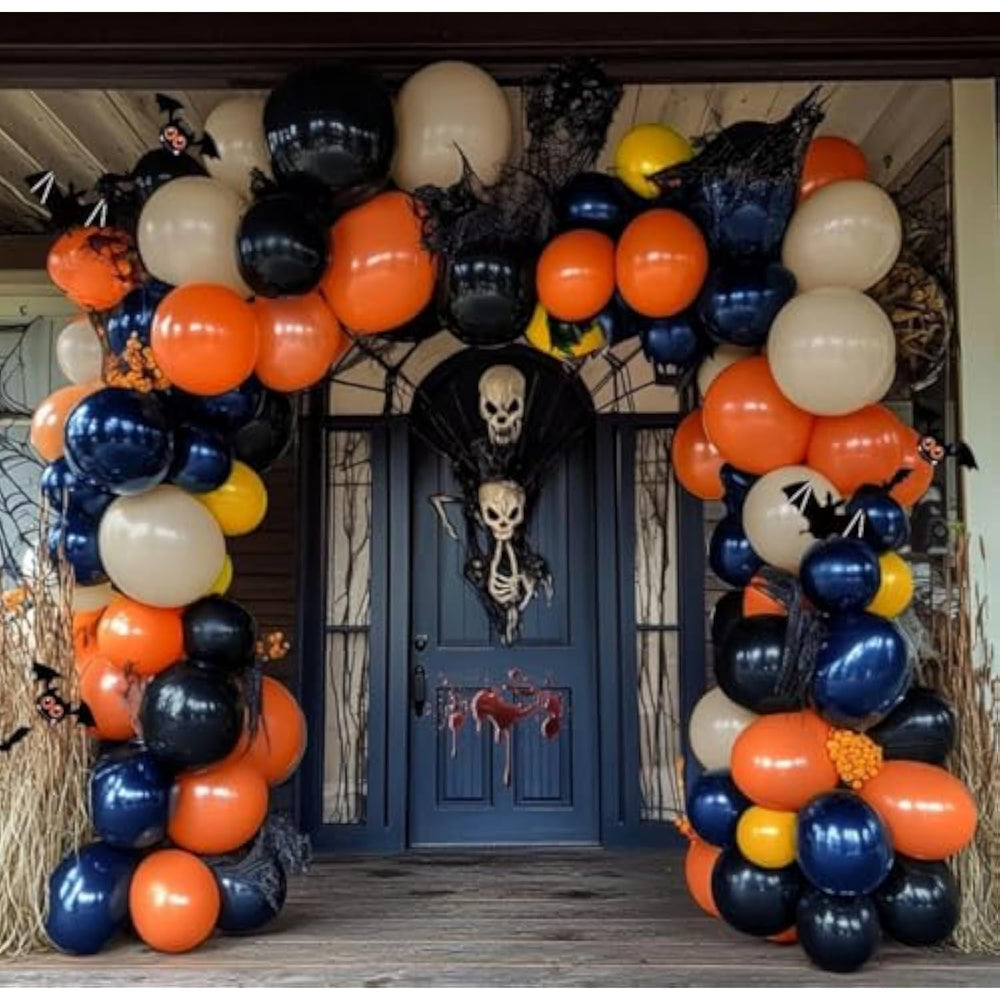 This Halloween balloon arch kit includes a mix of double-stuffed orange, navy blue, dark blue, yellow, sand white, and matte black balloons in various sizes, along with balloon tape, glue points, and curling ribbon for easy assembly. Made from durable, non-toxic latex, the balloons can be filled with air or helium, staying inflated for hours without easily bursting. The kit allows you to quickly create a vibrant garland or arch that adds a bold festive touch to Halloween parties, birthdays, or seasonal events, offering a fun DIY activity with professional-looking results.