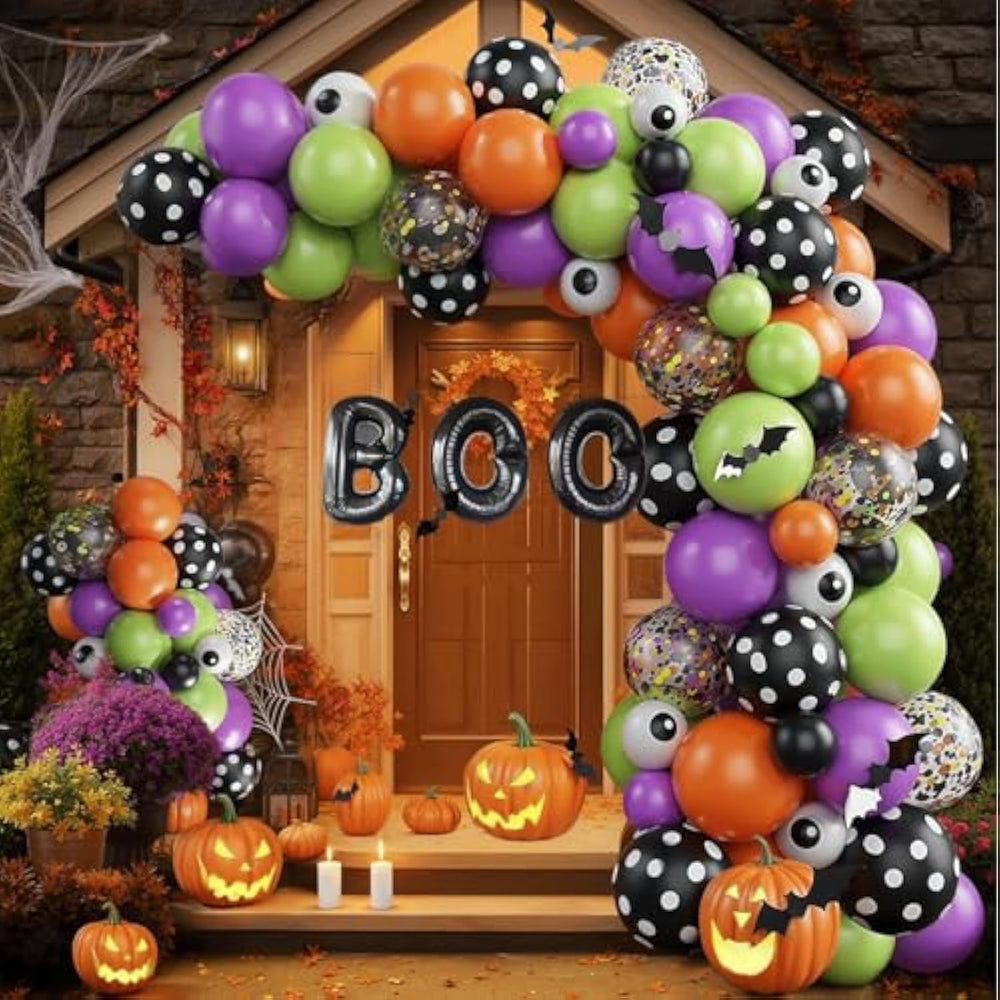 This Halloween balloon garland kit includes 136 pieces: 30 purple balloons, 30 orange balloons, 20 green balloons, 10 black balloons, 10 black-and-white dot balloons, 10 confetti balloons, 10 white eyeball balloons, a bat foil balloon, a “BOO” foil balloon, 12 3D bat stickers, one roll of strip, and five balloon stickers. Made from 100% natural latex, these balloons are durable, thick, long-lasting, and suitable for helium or air inflation. The kit comes with a strip and dot glue for easy assembly, while the foil balloons and 3D bat stickers add a fun, festive touch for a vivid Halloween atmosphere. Perfect for Halloween party decorations, trick-or-treat setups, hocus pocus parties, indoor or outdoor displays, school events, bars, and stage props, this kit helps create unforgettable memories with family and friends.